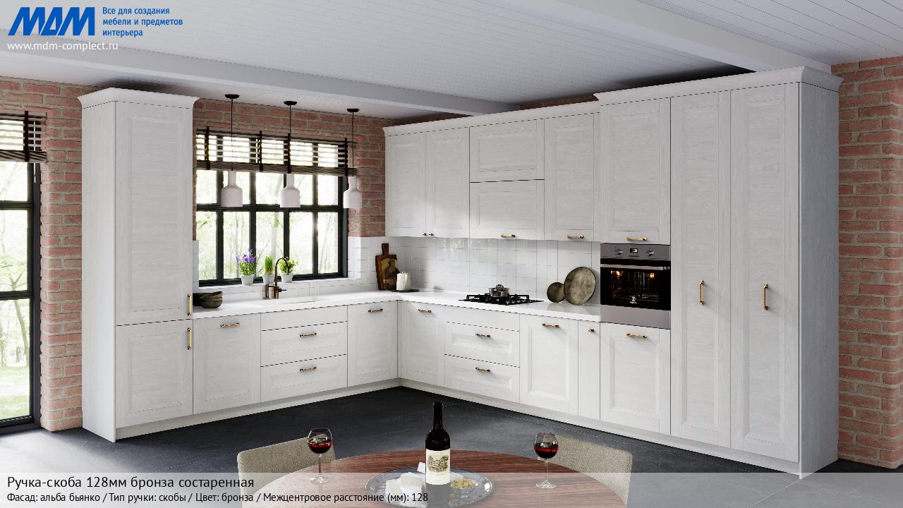 Мебельная Ручка-скоба 128мм бронза состаренная на различных фасадах в кухонном интерьере в стиле классика, лофт, модерн.
