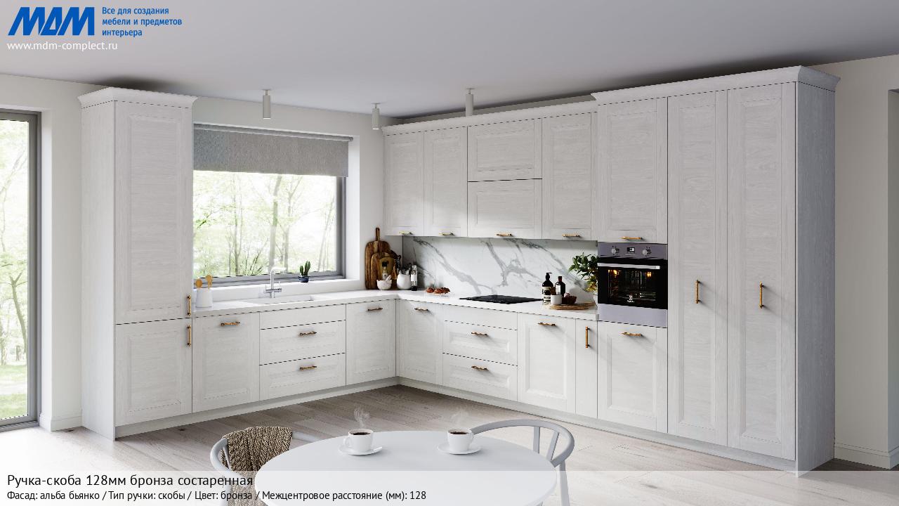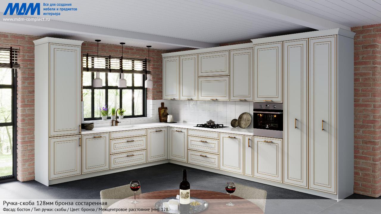 Мебельная Ручка-скоба 128мм бронза состаренная на различных фасадах в кухонном интерьере в стиле классика, лофт, модерн.
