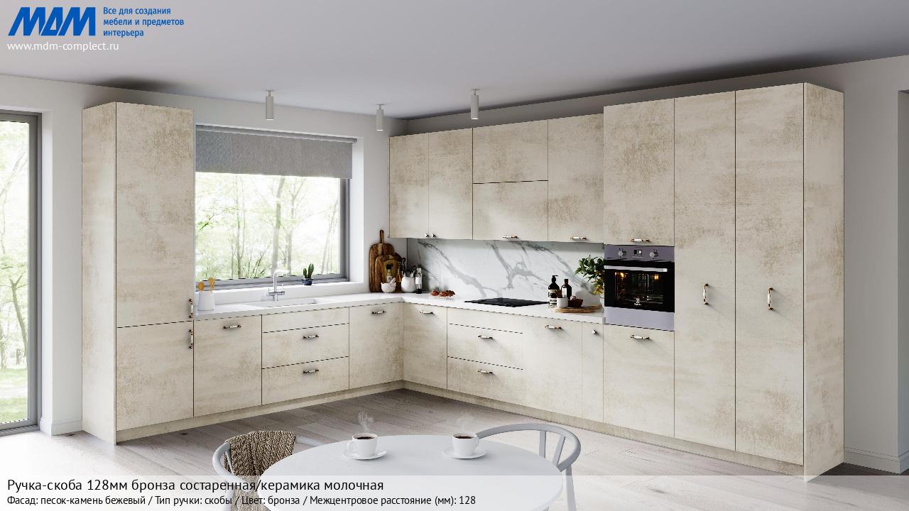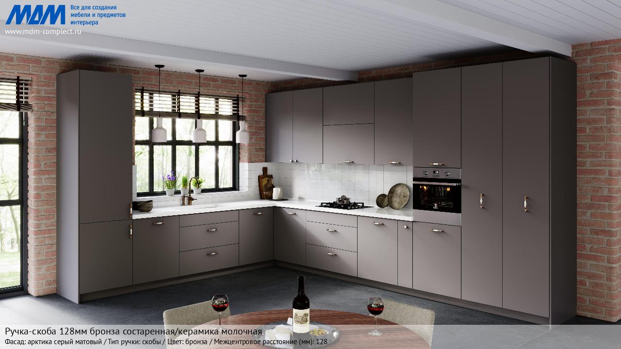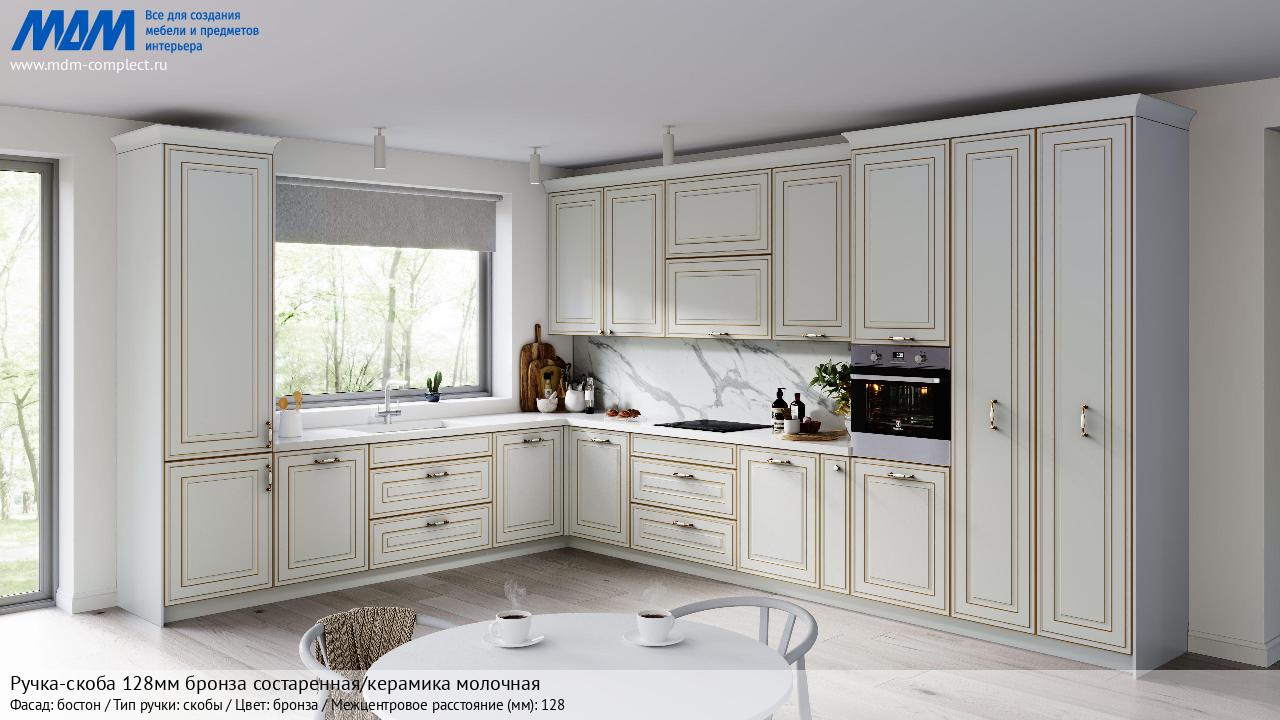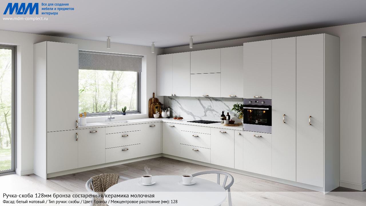 Мебельная Ручка-скоба 128мм бронза состаренная/керамика молочная на различных фасадах в кухонном интерьере в стиле классика, лофт, модерн.