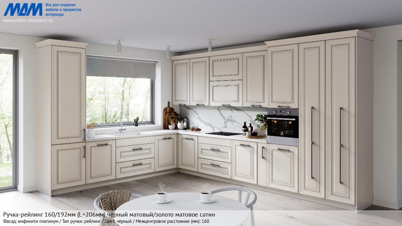 Мебельная Ручка-рейлинг 160/192мм (L=206мм) черный матовый/золото матовое сатин на различных фасадах в кухонном интерьере в стиле классика, лофт, модерн.