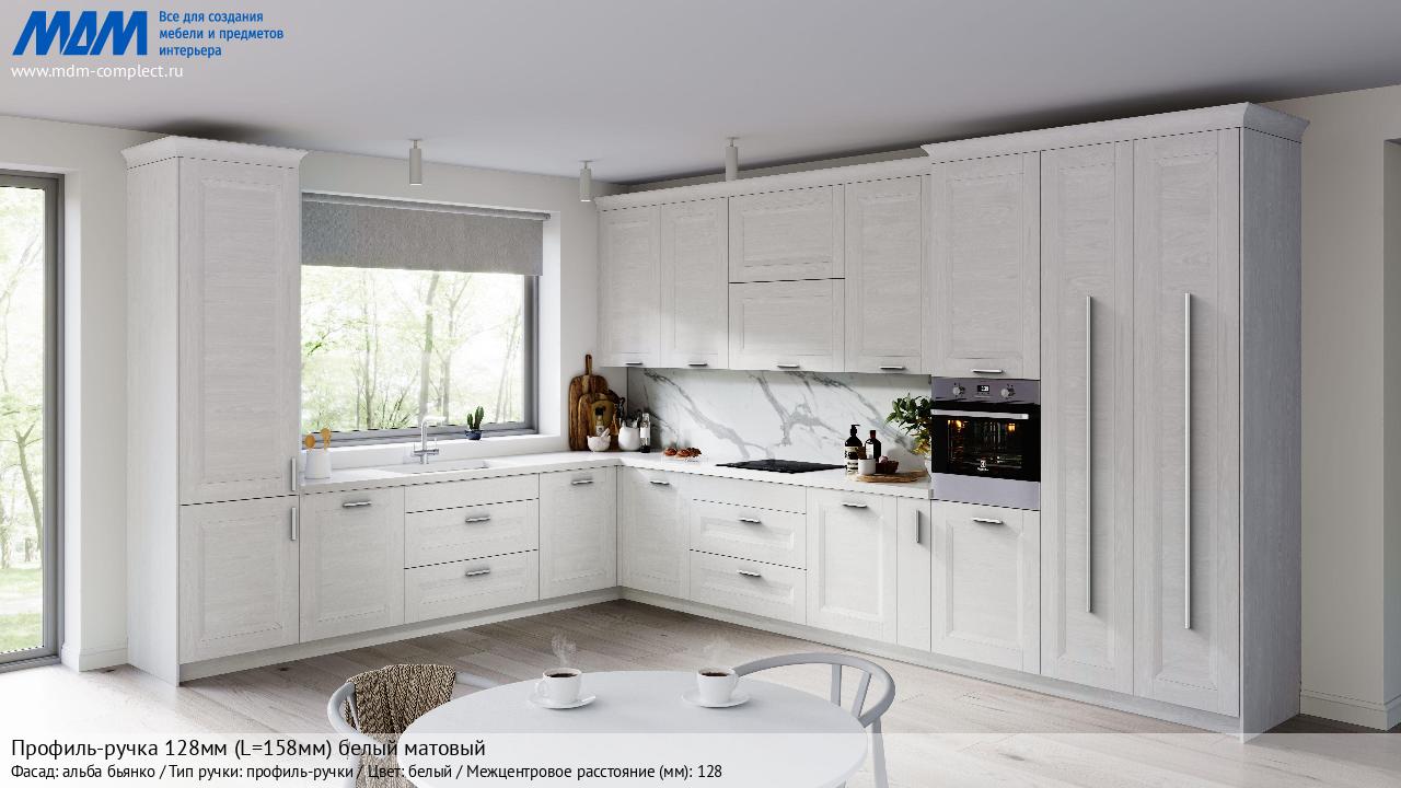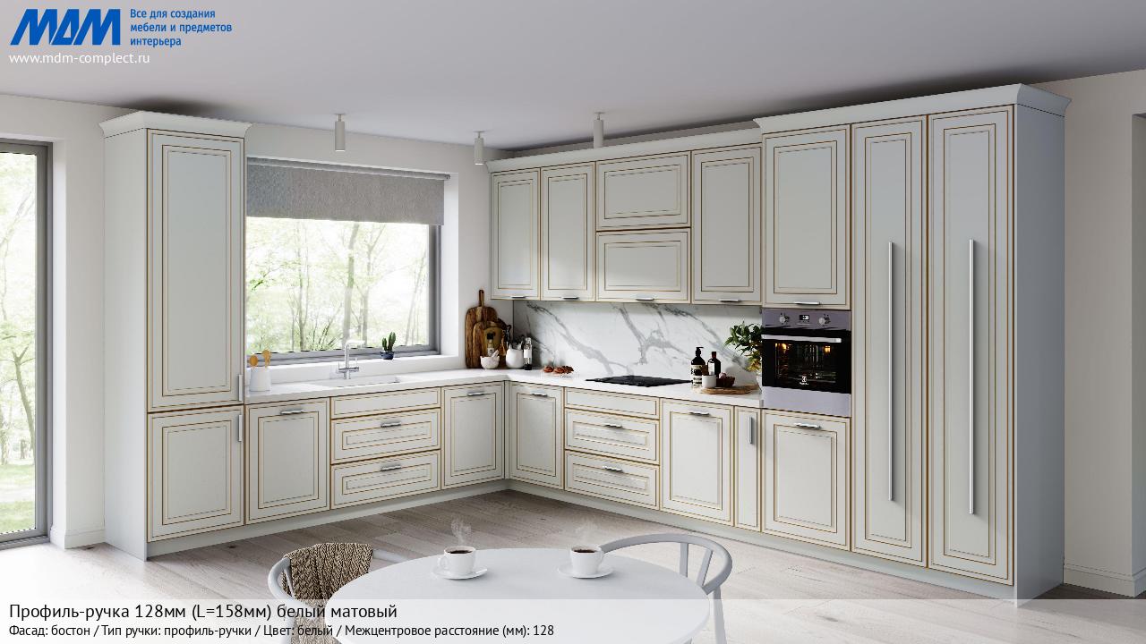 Мебельная Профиль-ручка 128мм (L=158мм) белый матовый на различных фасадах в кухонном интерьере в стиле классика, лофт, модерн.