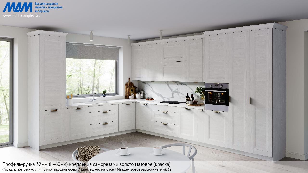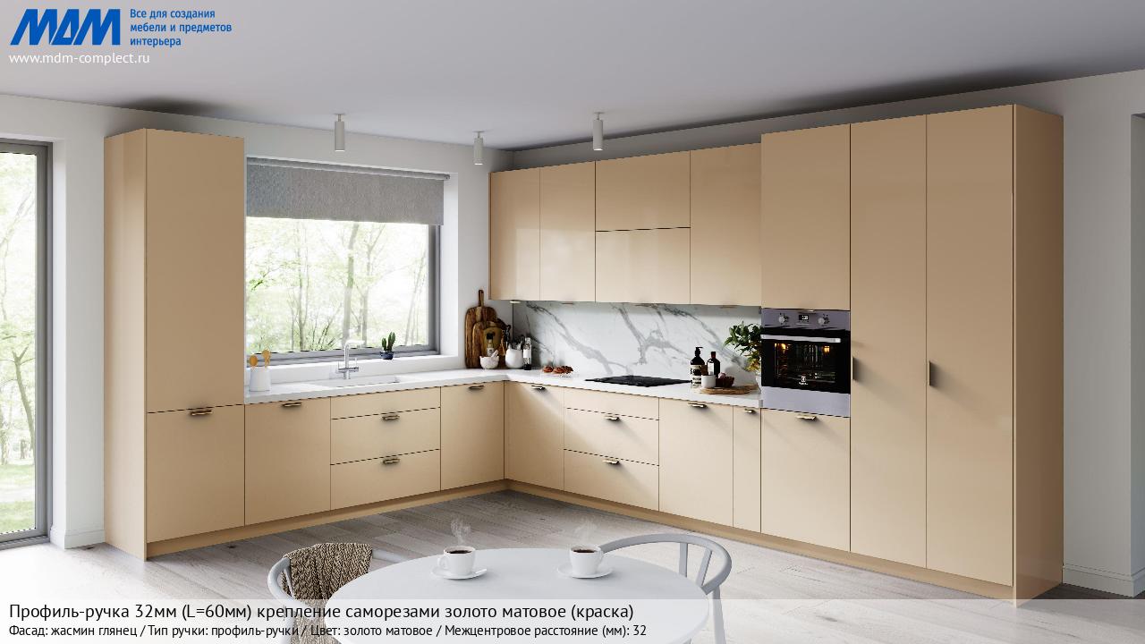 Мебельная Профиль-ручка 32мм (L=60мм) крепление саморезами золото матовое (краска) на различных фасадах в кухонном интерьере в стиле классика, лофт, модерн.