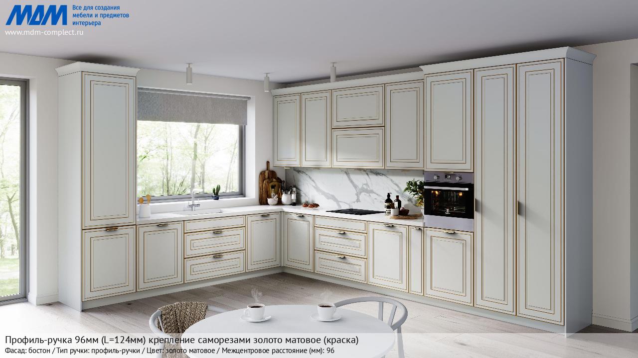 Мебельная Профиль-ручка 96мм (L=124мм) крепление саморезами золото матовое (краска) на различных фасадах в кухонном интерьере в стиле классика, лофт, модерн.