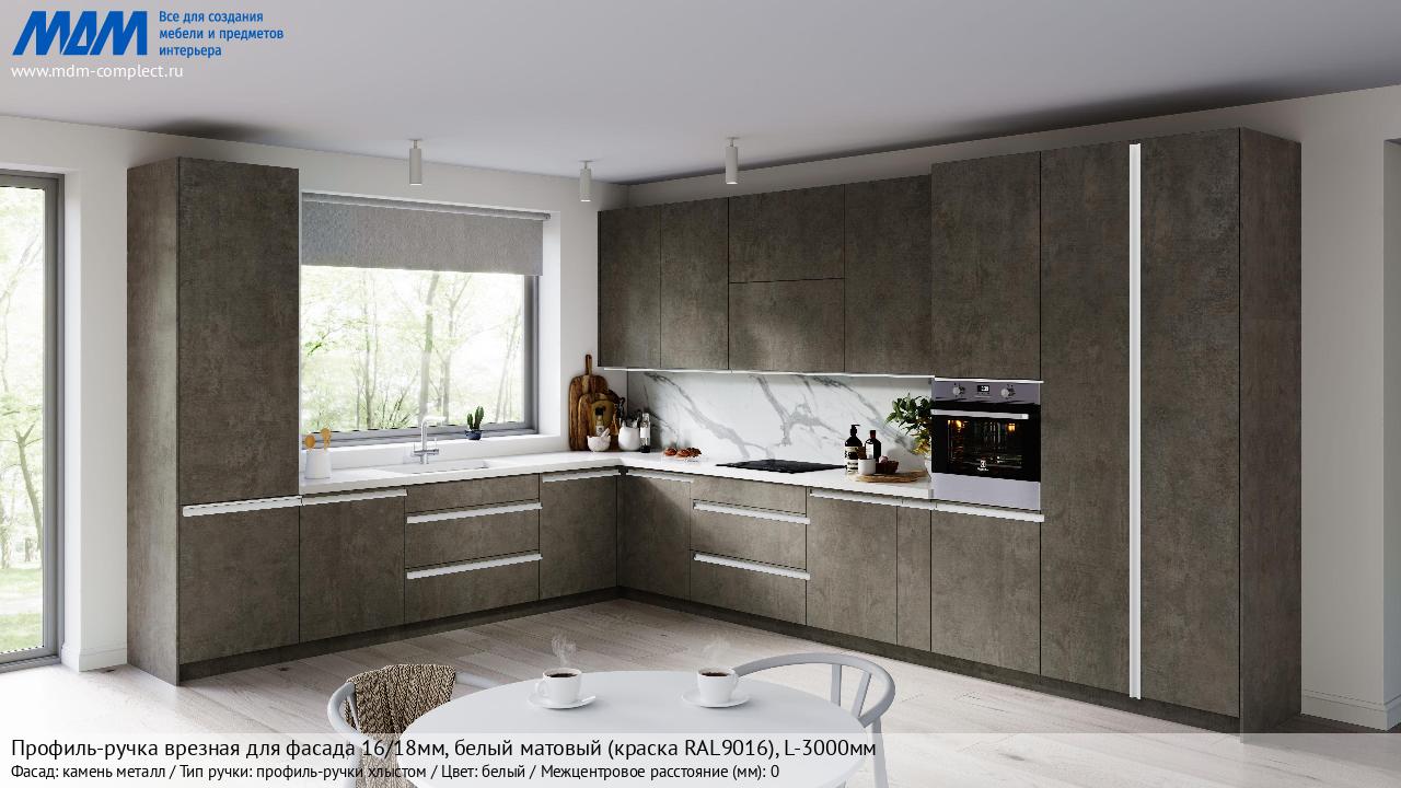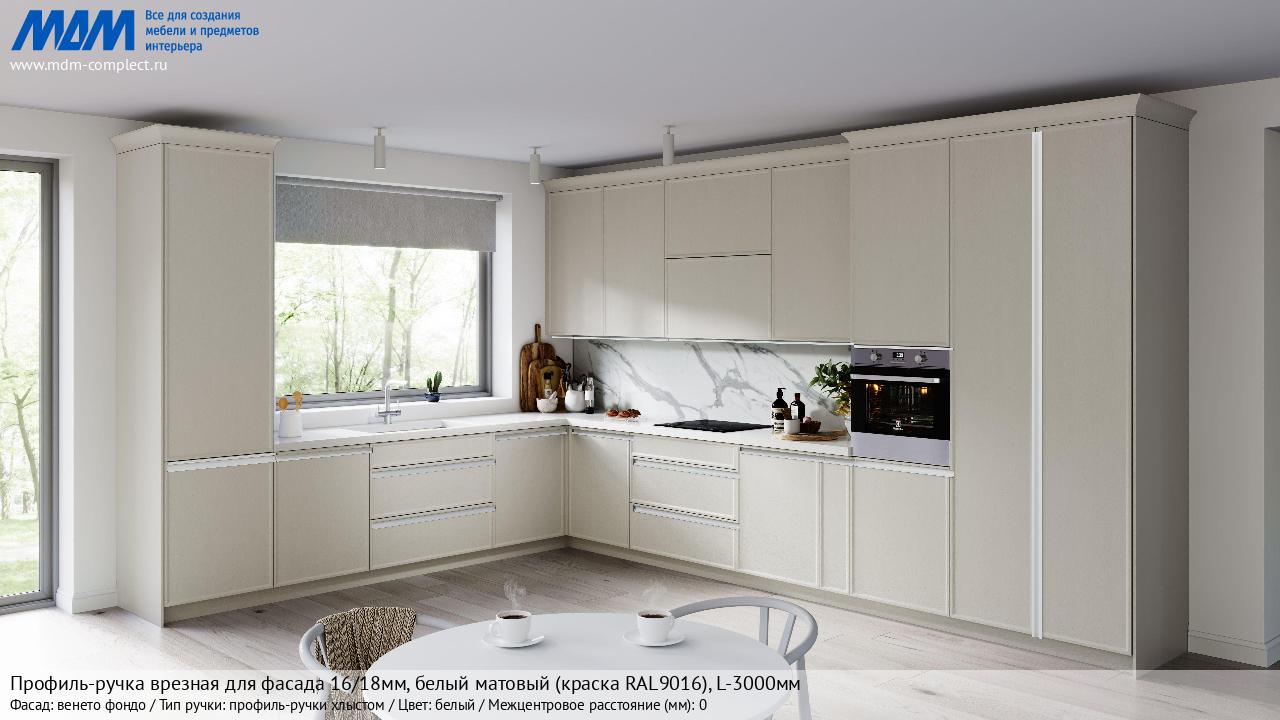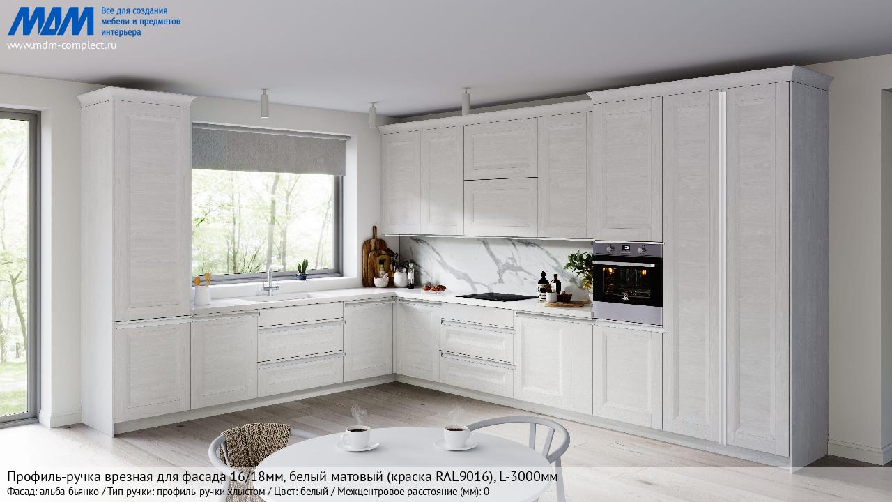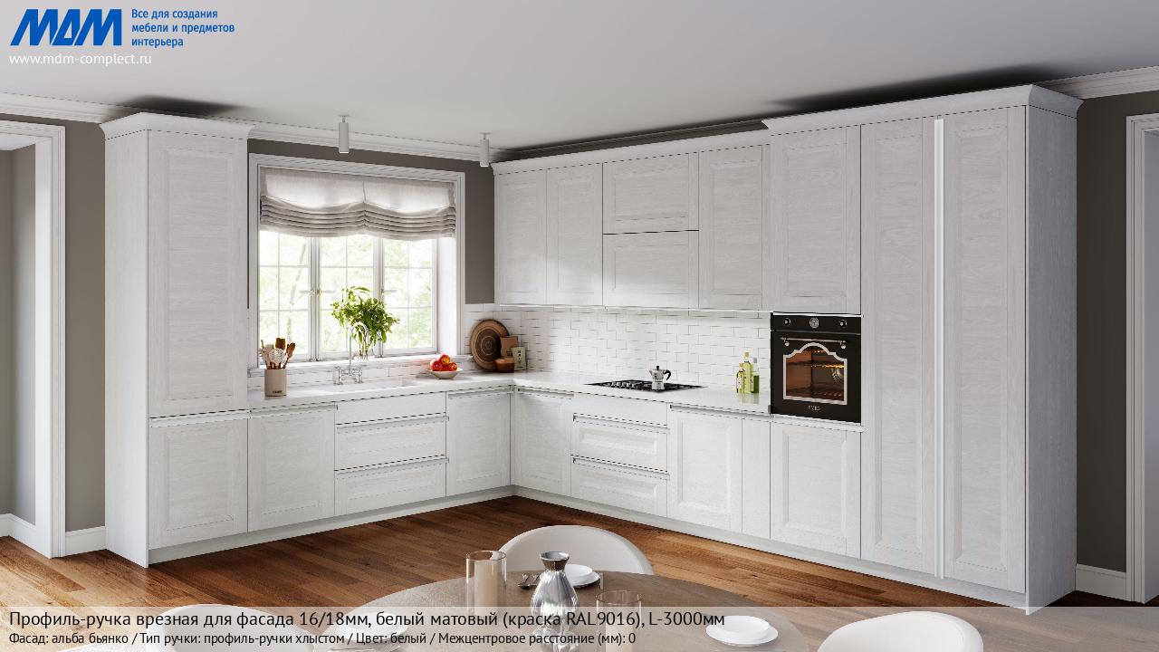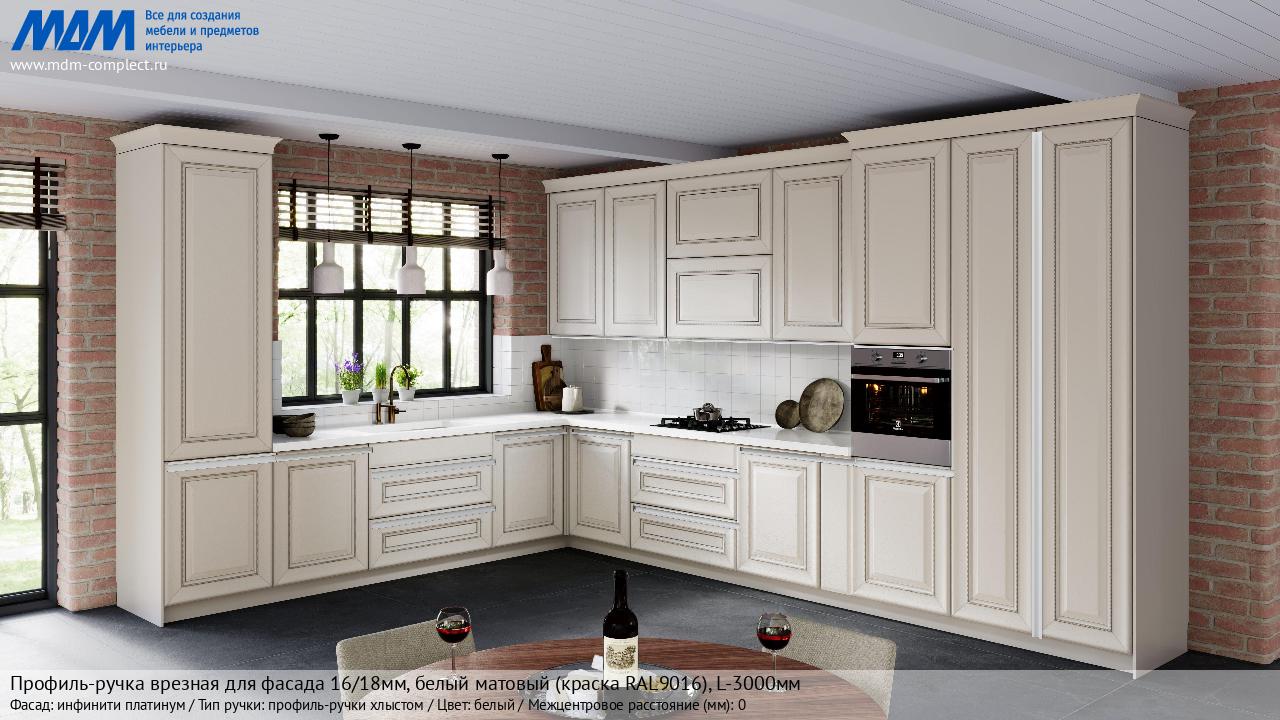 Мебельная Профиль-ручка врезная для фасада 16/18мм, белый матовый (краска RAL9016), L-3000мм на различных фасадах в кухонном интерьере в стиле классика, лофт, модерн.