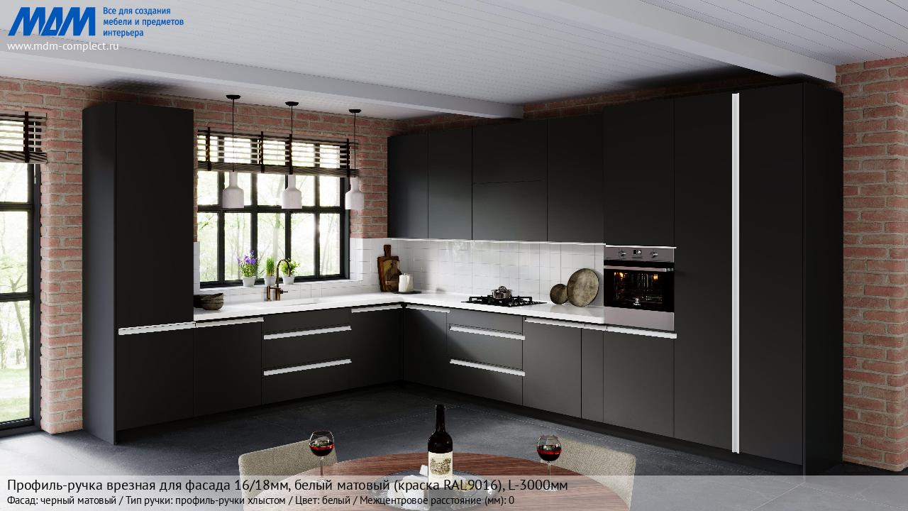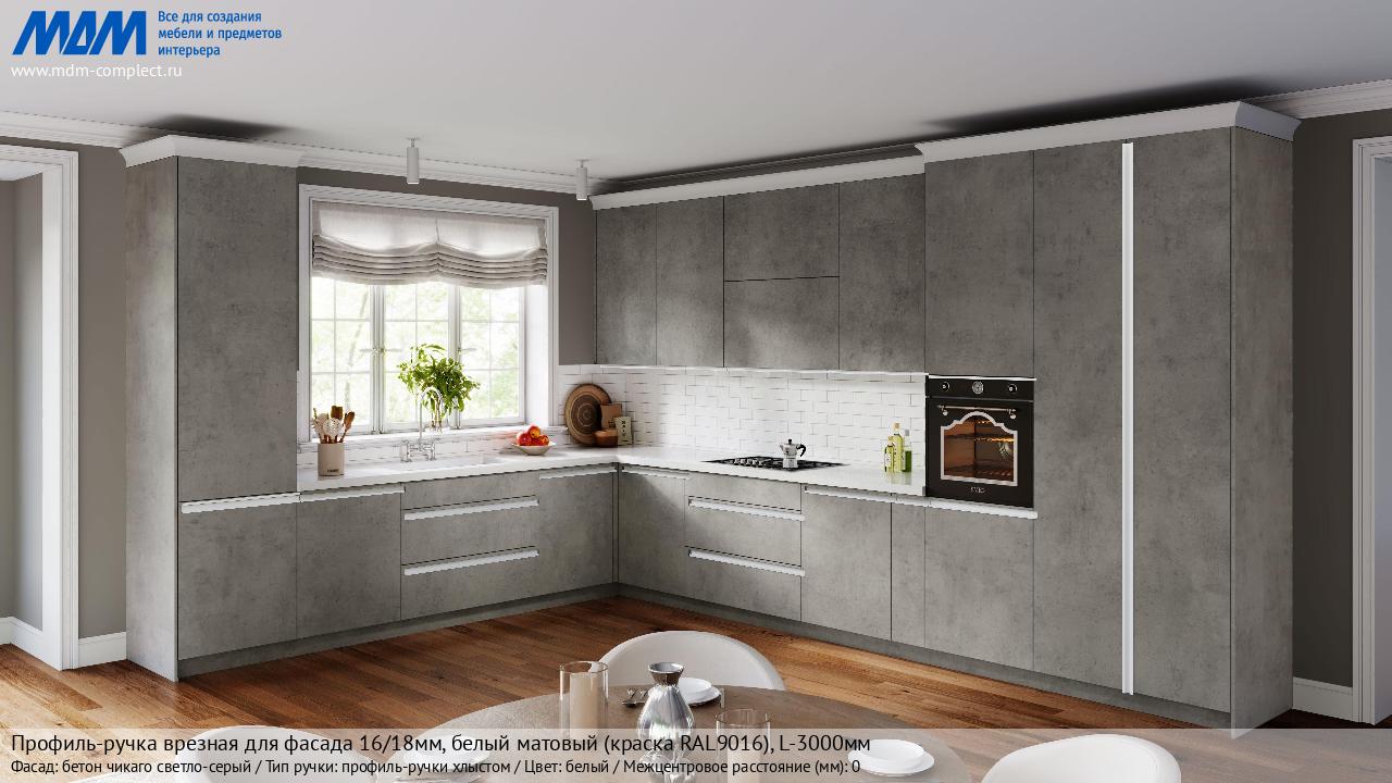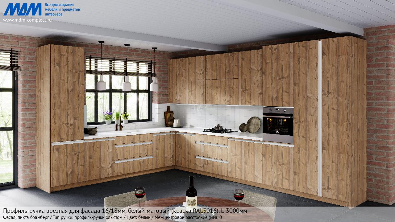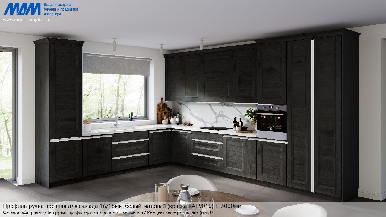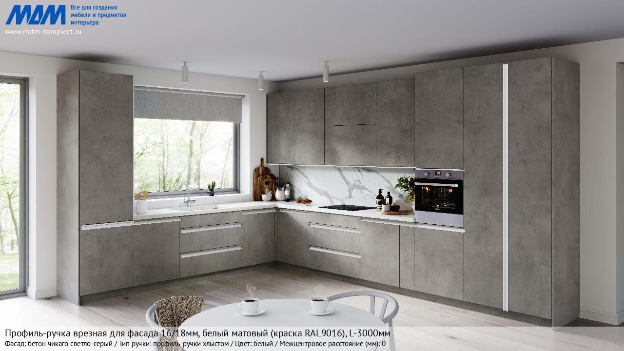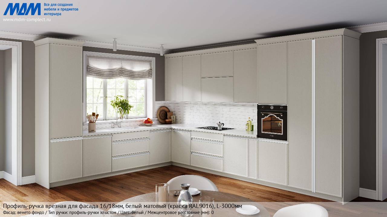 Мебельная Профиль-ручка врезная для фасада 16/18мм, белый матовый (краска RAL9016), L-3000мм на различных фасадах в кухонном интерьере в стиле классика, лофт, модерн.
