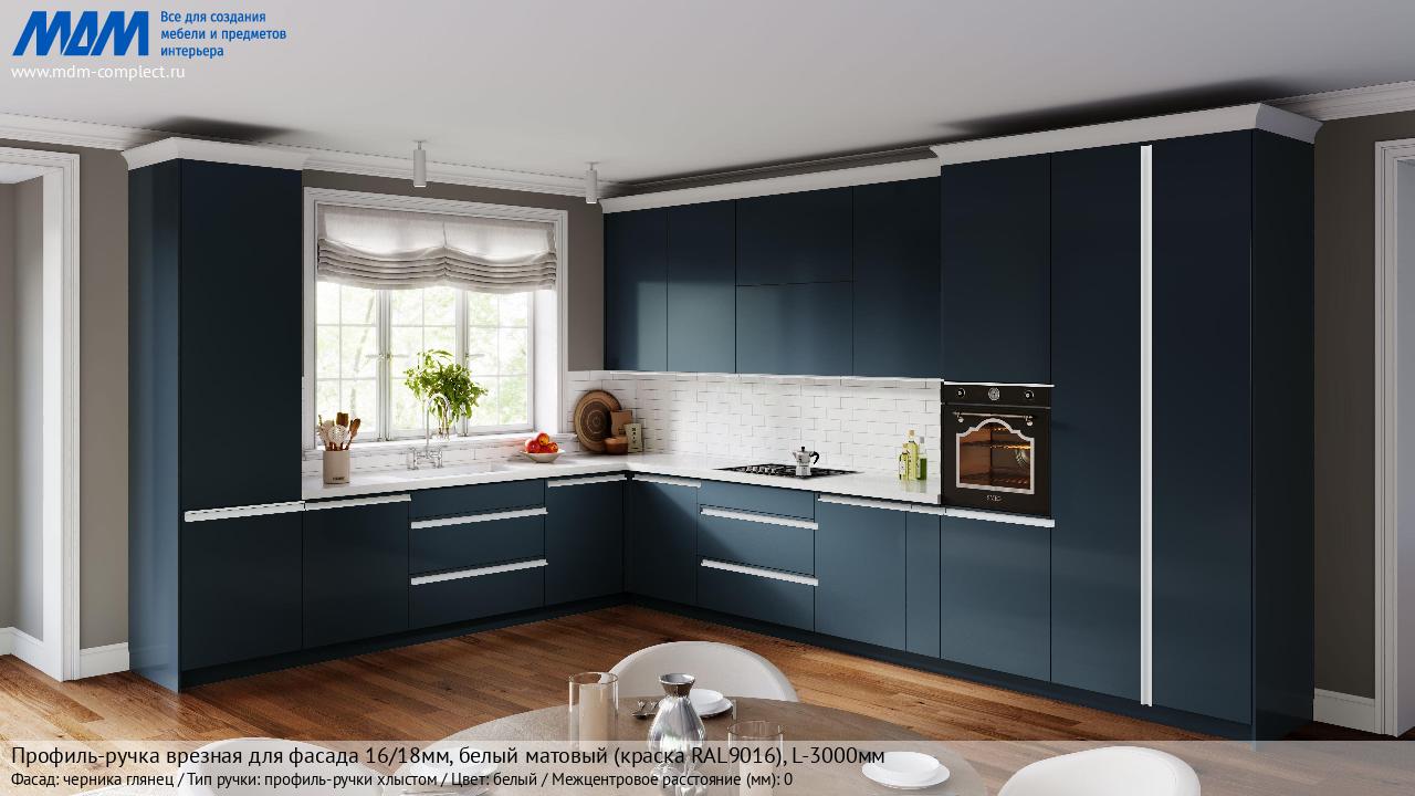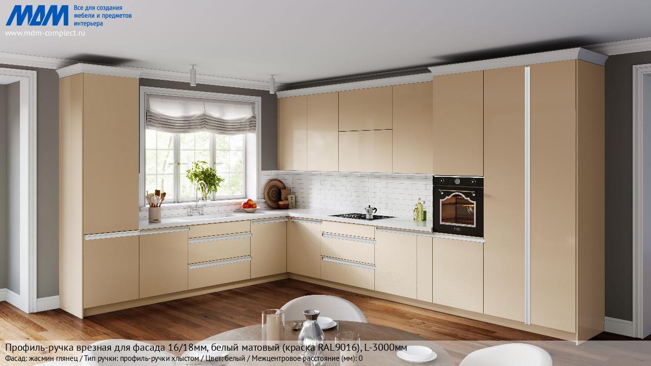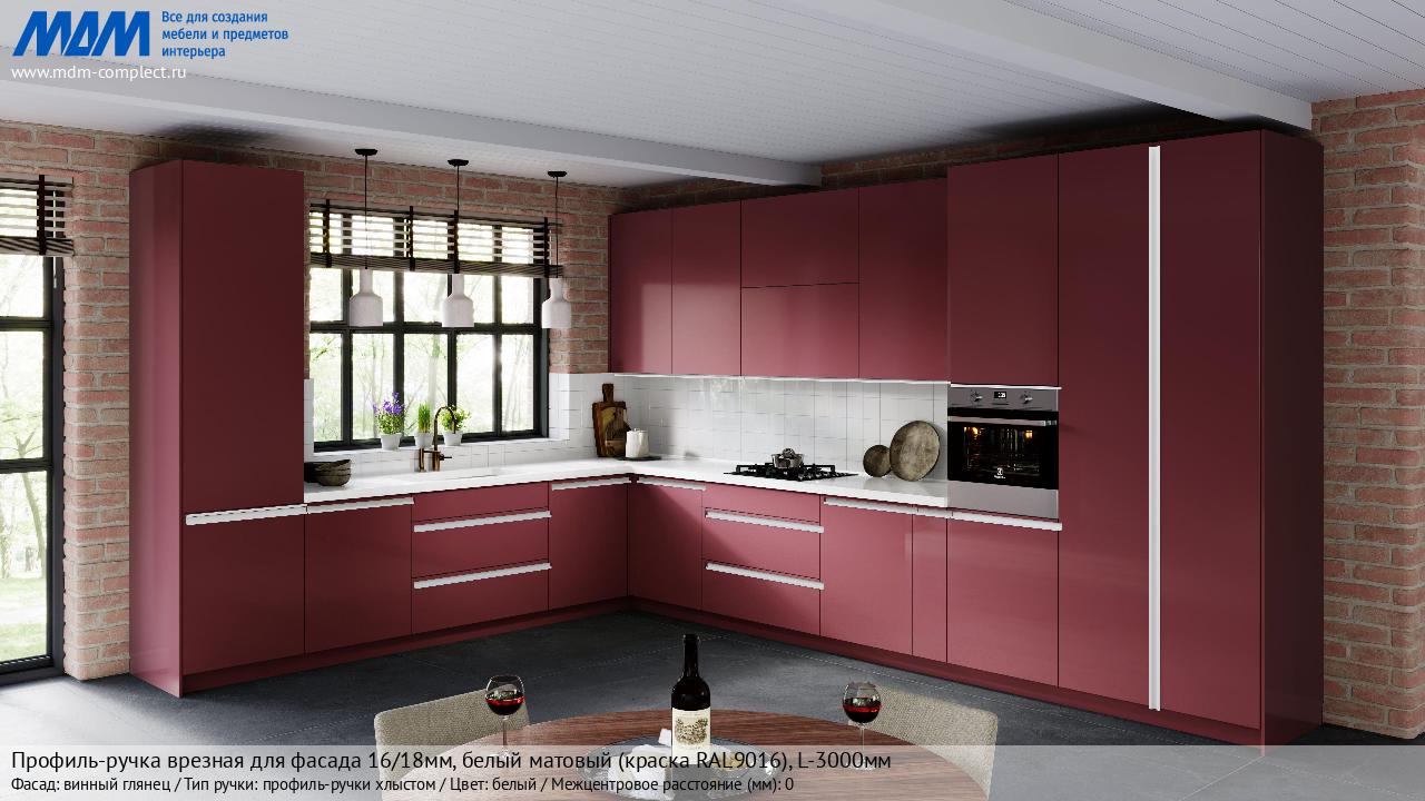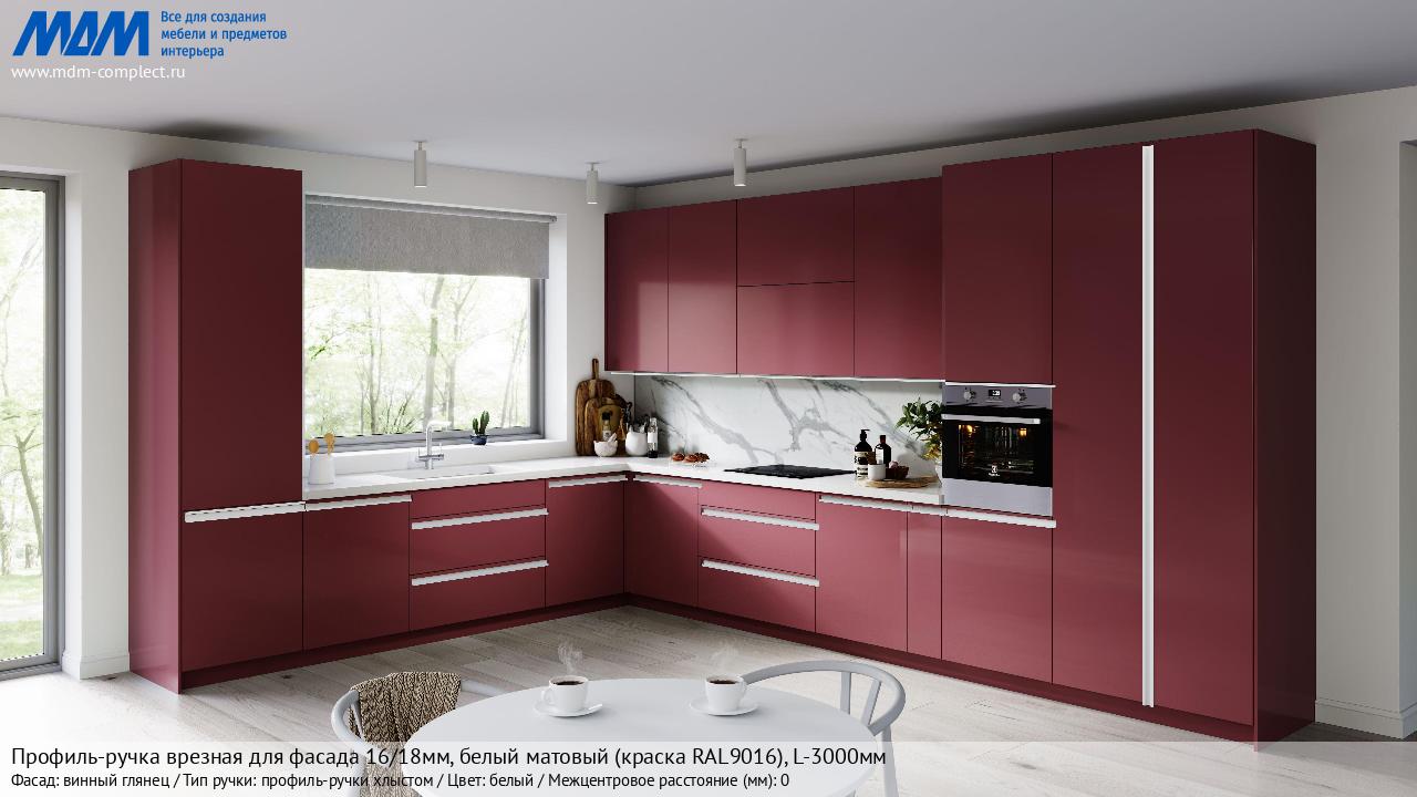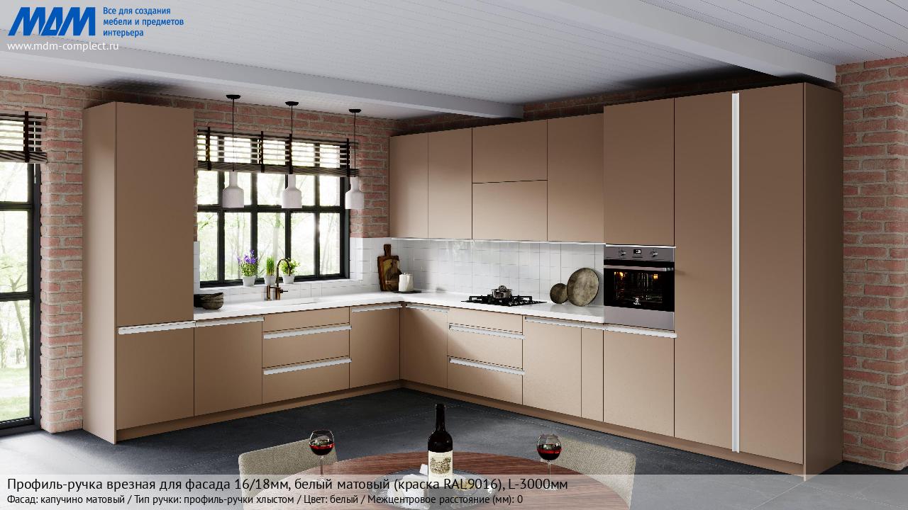 Мебельная Профиль-ручка врезная для фасада 16/18мм, белый матовый (краска RAL9016), L-3000мм на различных фасадах в кухонном интерьере в стиле классика, лофт, модерн.