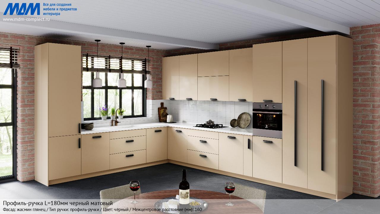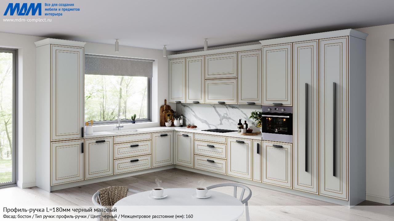 Мебельная Профиль-ручка L=180мм черный матовый на различных фасадах в кухонном интерьере в стиле классика, лофт, модерн.