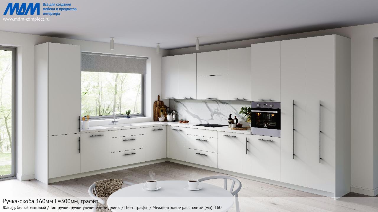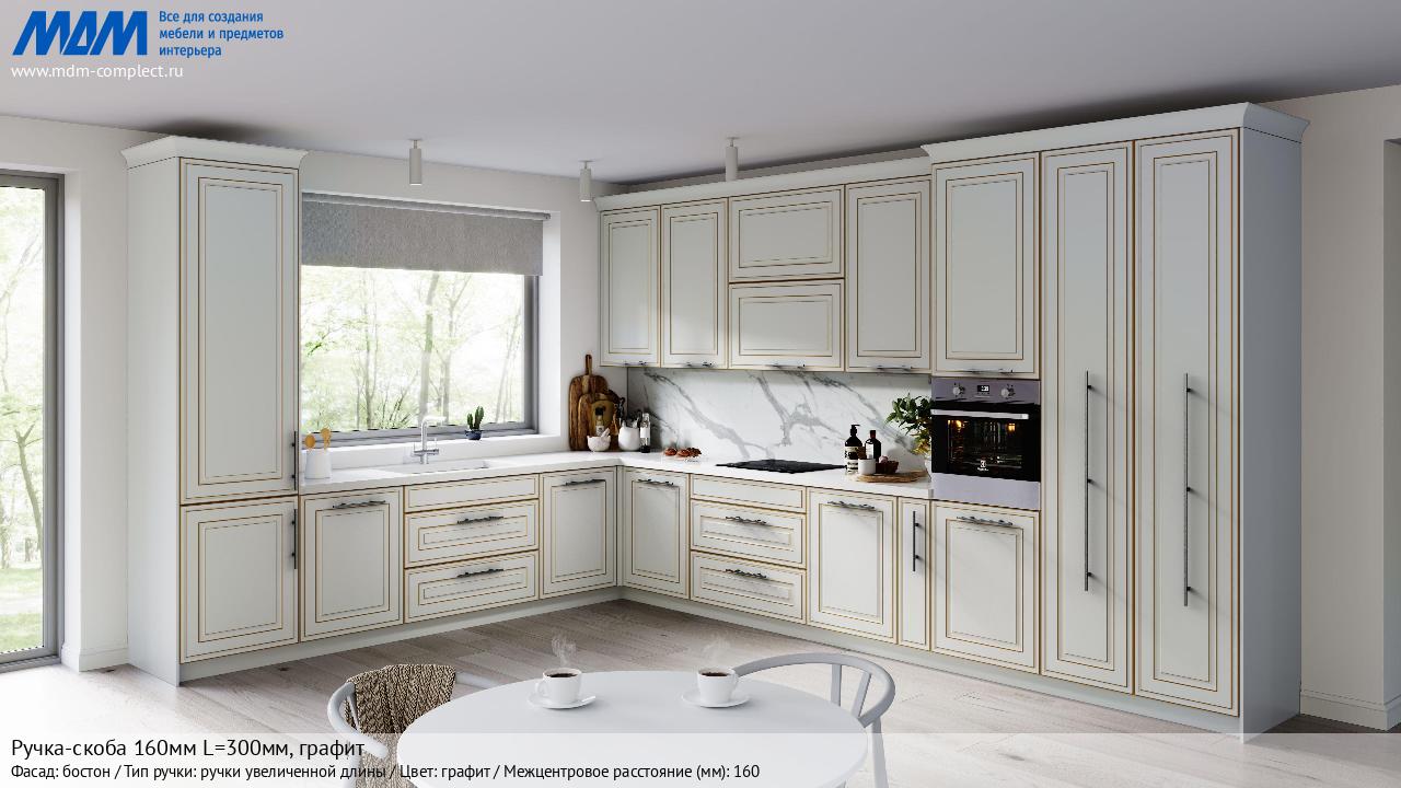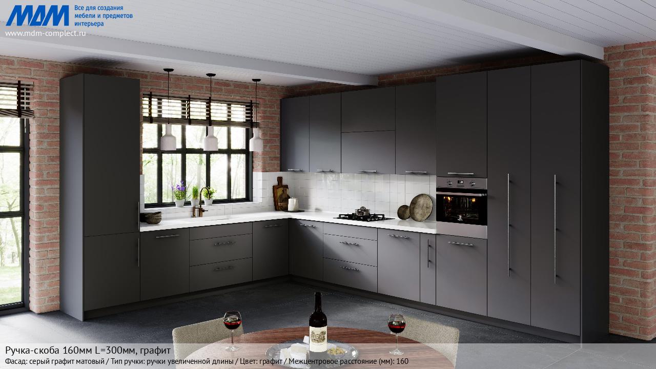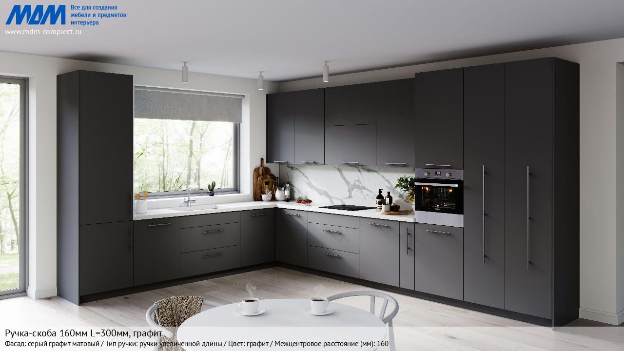 Мебельная Ручка-скоба 160мм L=300мм, графит на различных фасадах в кухонном интерьере в стиле классика, лофт, модерн.