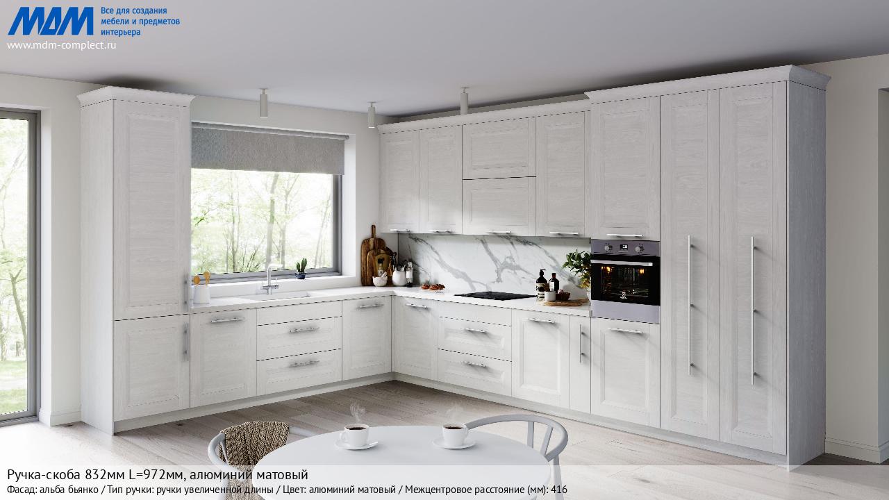 Мебельная Ручка-скоба 832мм L=972мм, алюминий матовый на различных фасадах в кухонном интерьере в стиле классика, лофт, модерн.