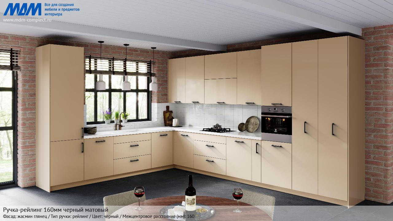 Мебельная Ручка-рейлинг 160мм черный матовый на различных фасадах в кухонном интерьере в стиле классика, лофт, модерн.