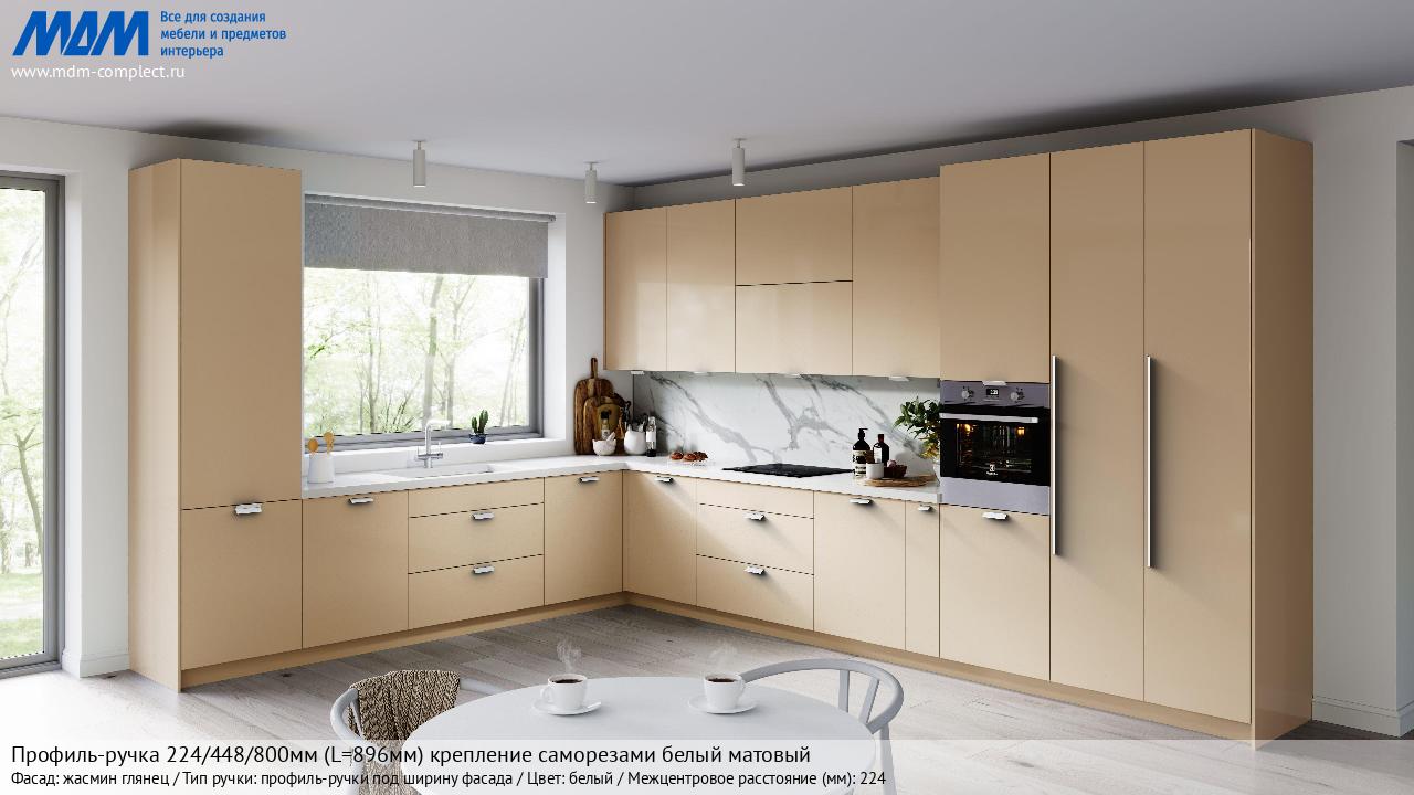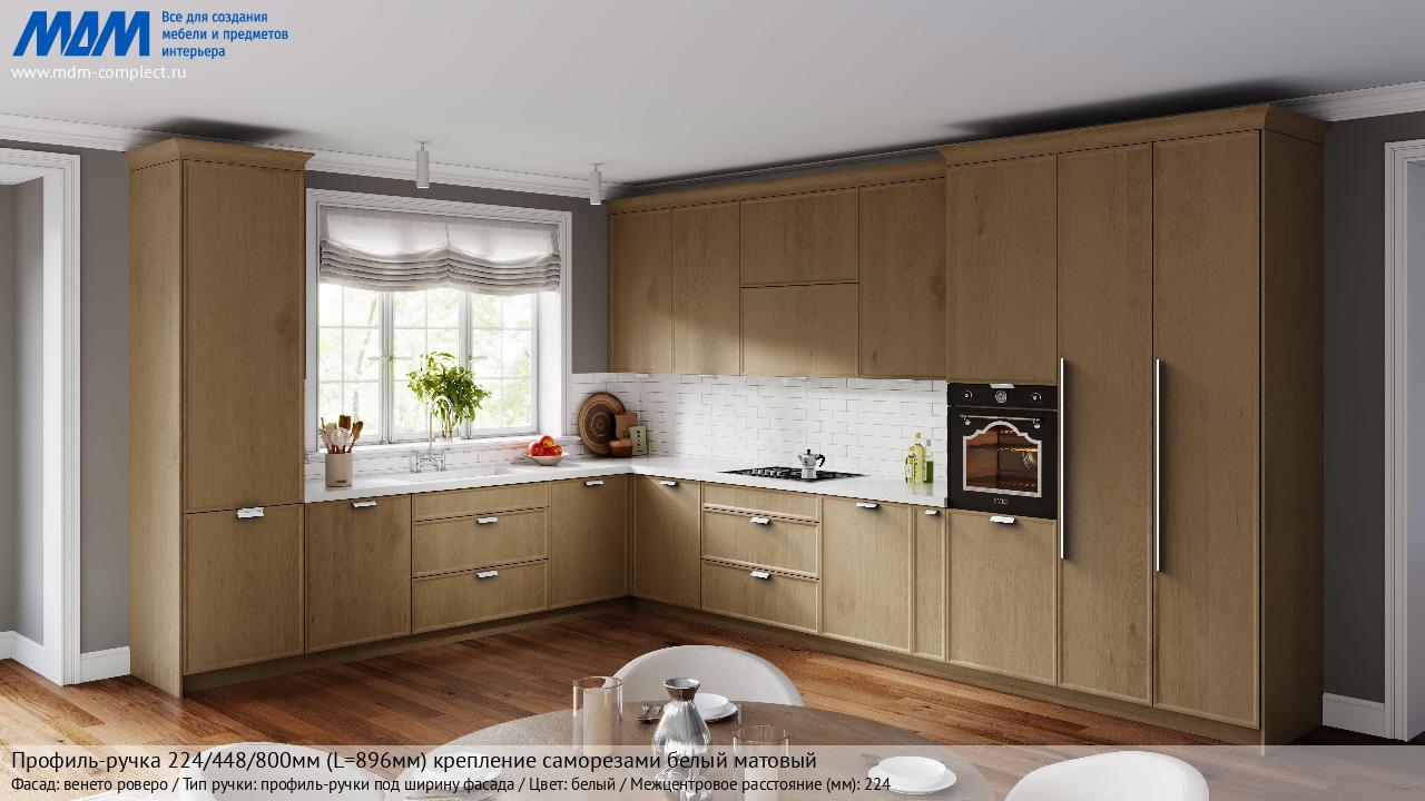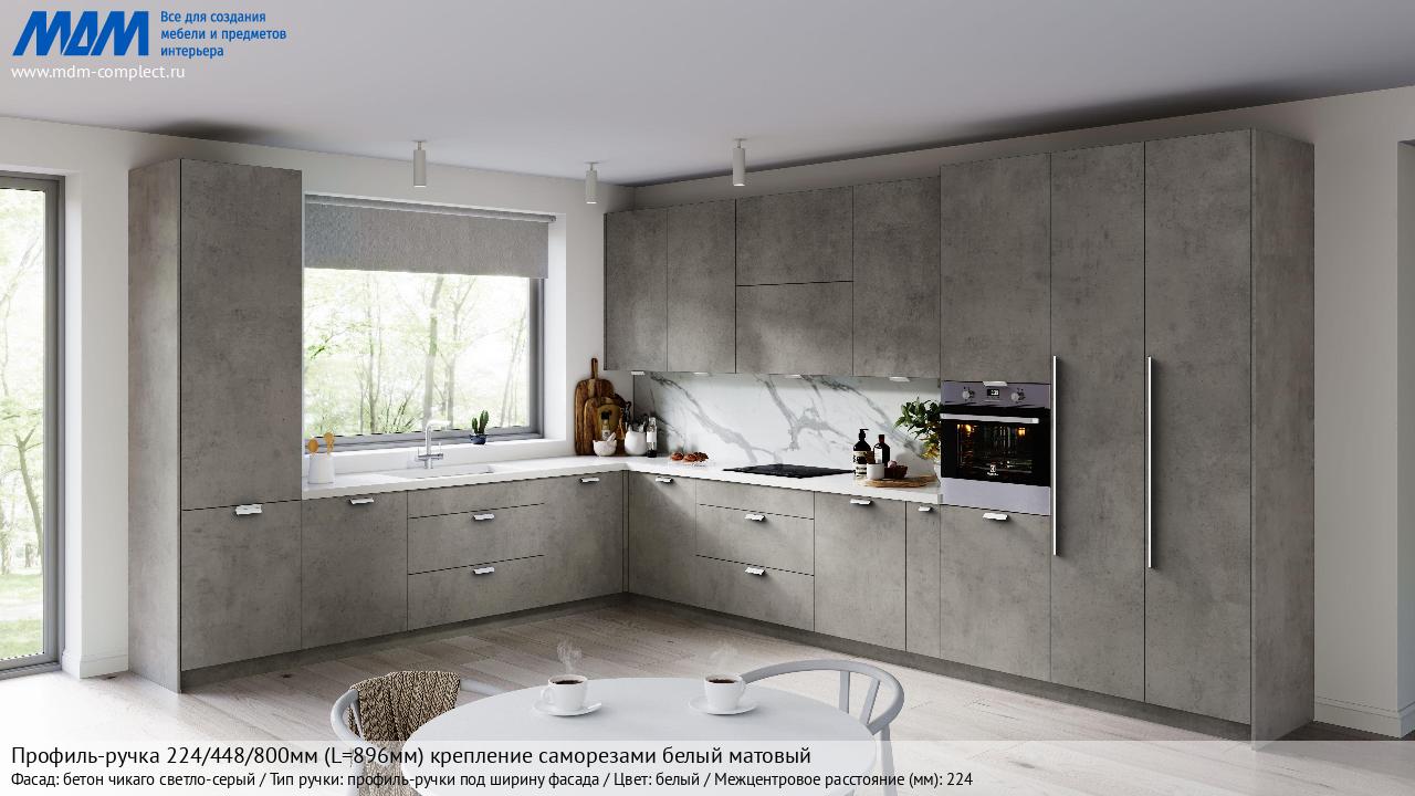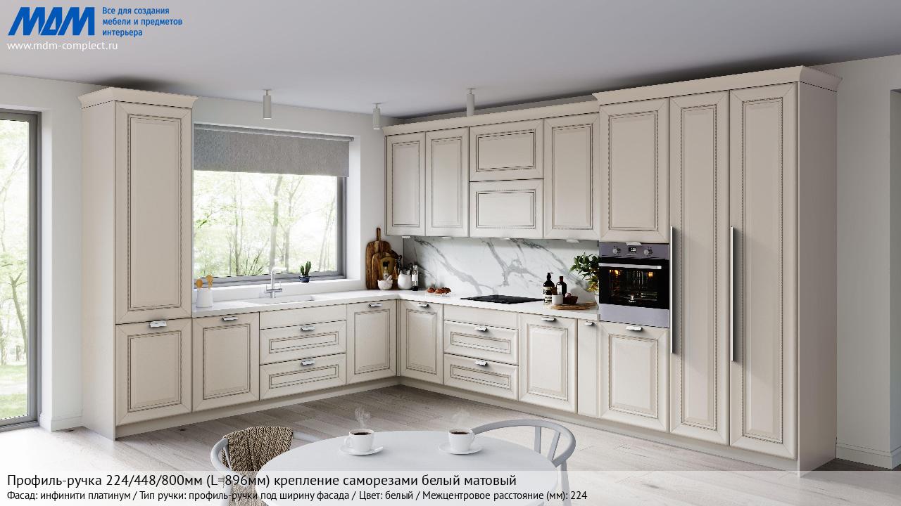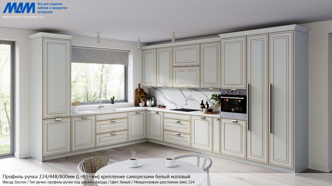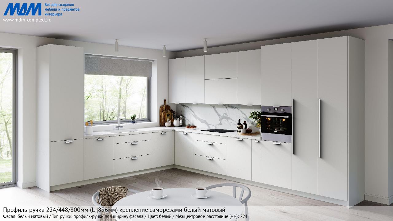 Мебельная Профиль-ручка 224/448/800мм (L=896мм) крепление саморезами белый матовый на различных фасадах в кухонном интерьере в стиле классика, лофт, модерн.