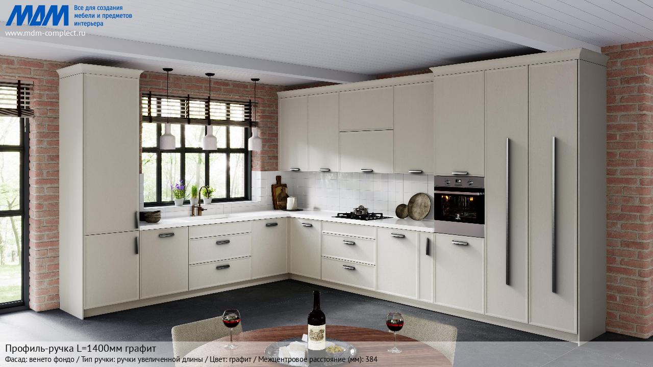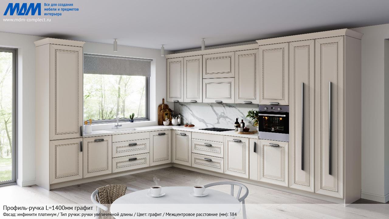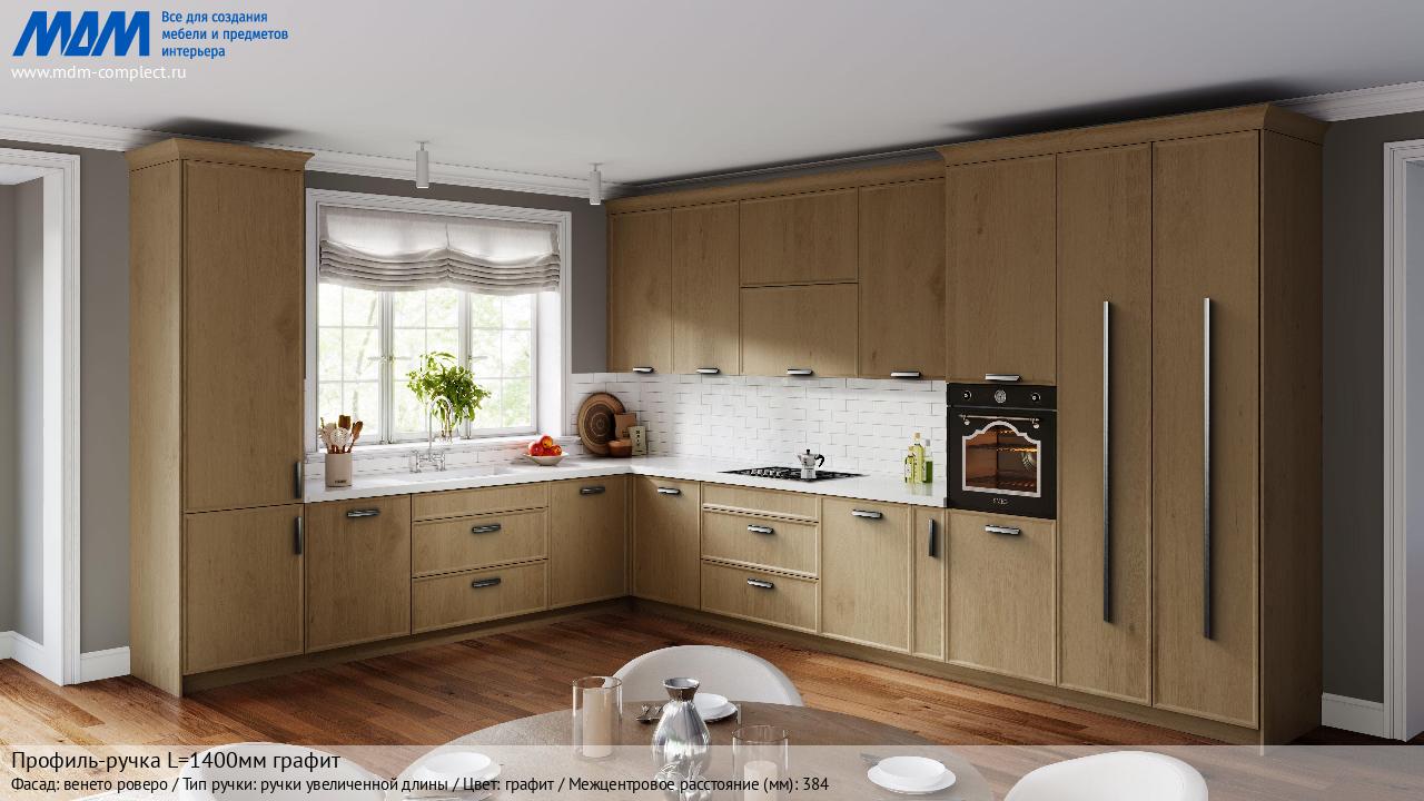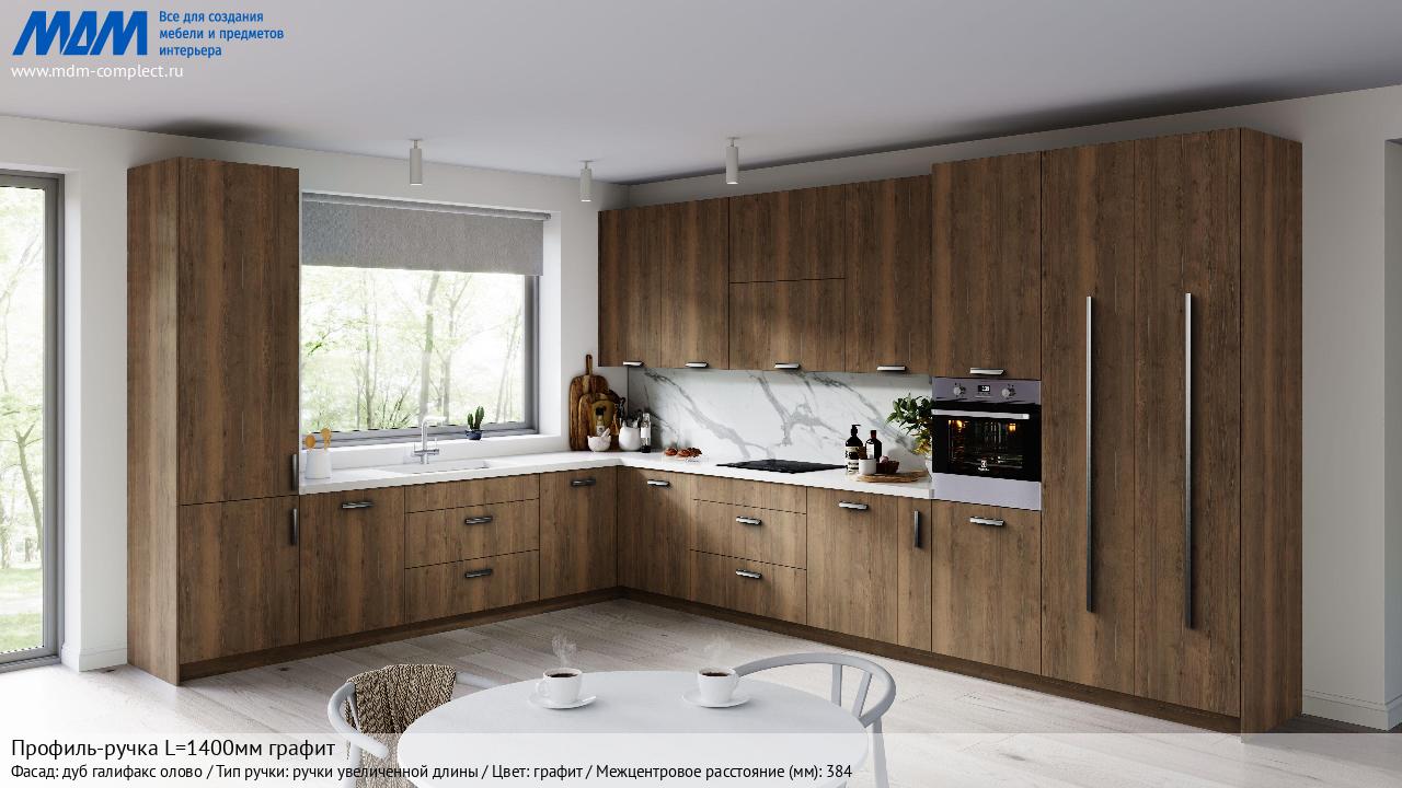 Мебельная Профиль-ручка L=1400мм графит на различных фасадах в кухонном интерьере в стиле классика, лофт, модерн.