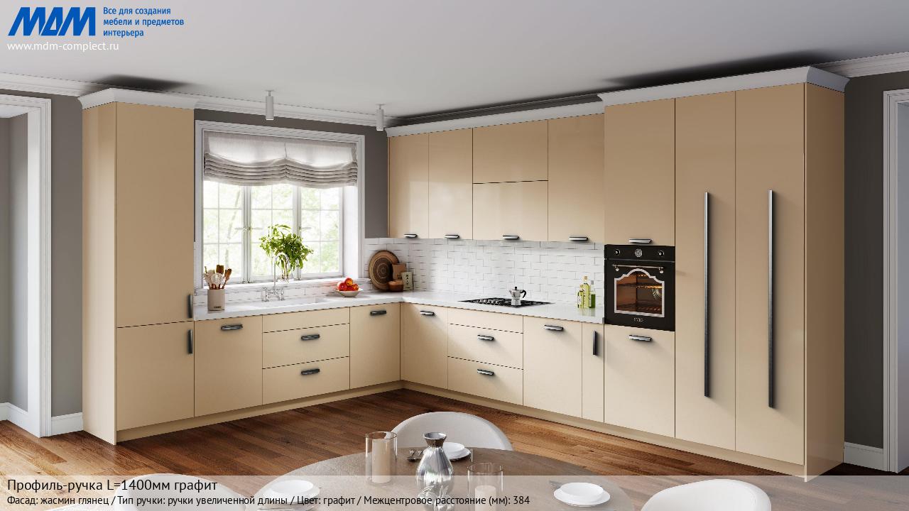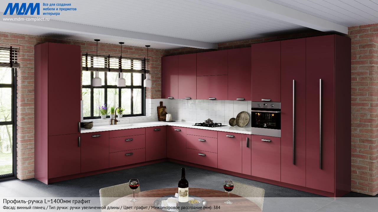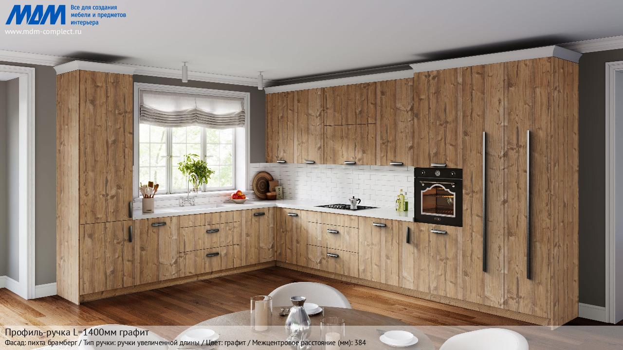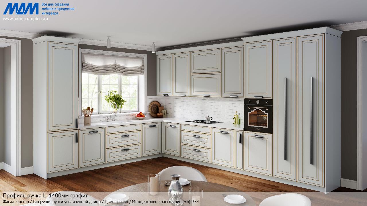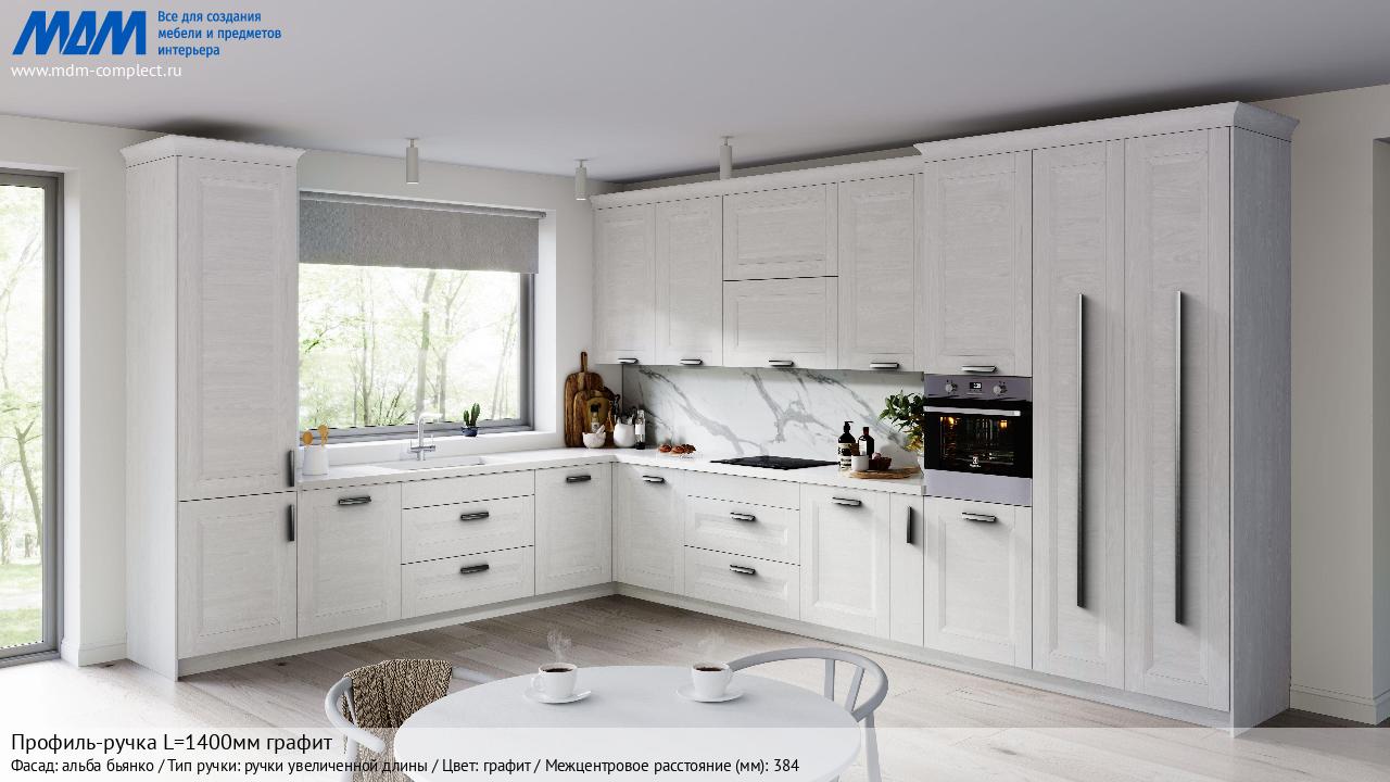 Мебельная Профиль-ручка L=1400мм графит на различных фасадах в кухонном интерьере в стиле классика, лофт, модерн.