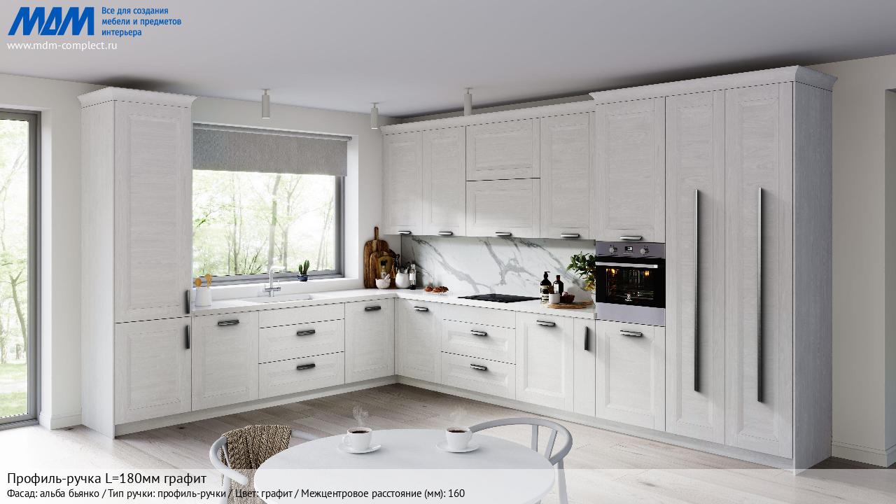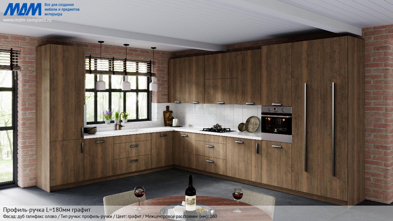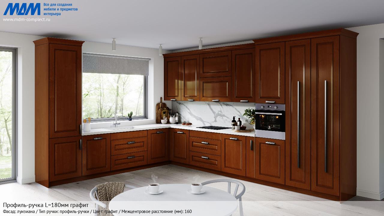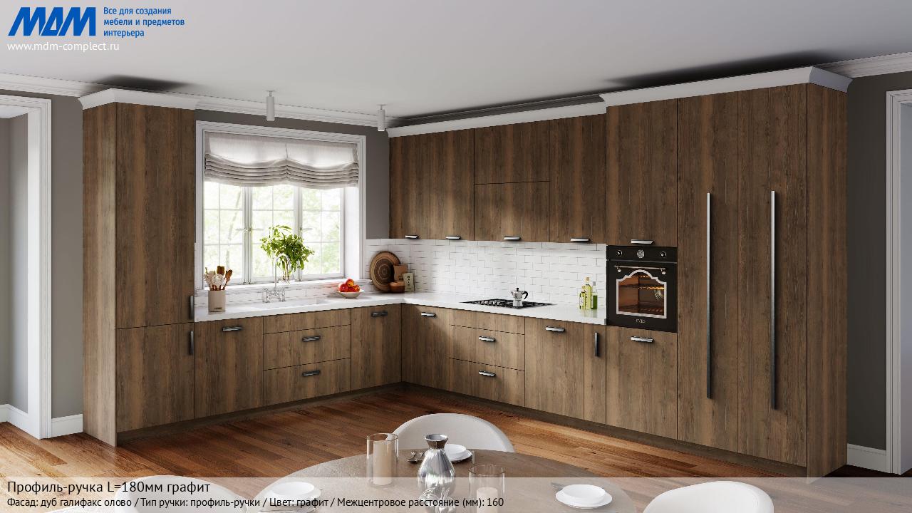 Мебельная Профиль-ручка L=180мм графит на различных фасадах в кухонном интерьере в стиле классика, лофт, модерн.
