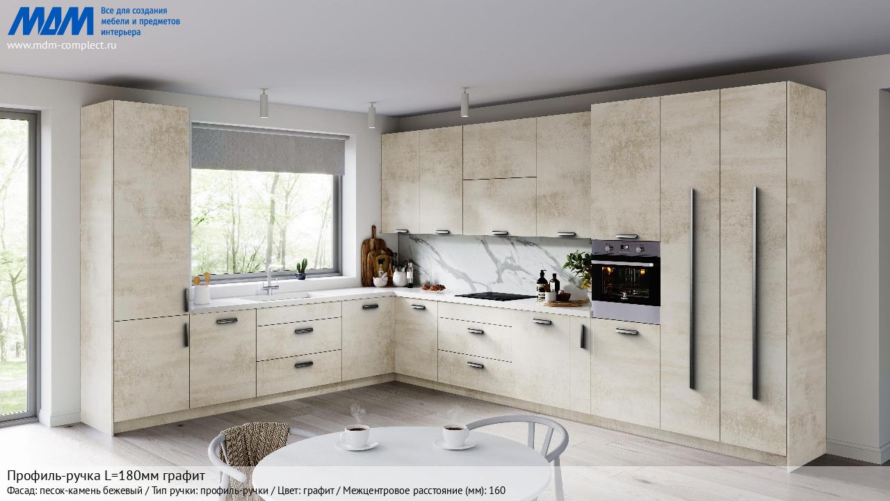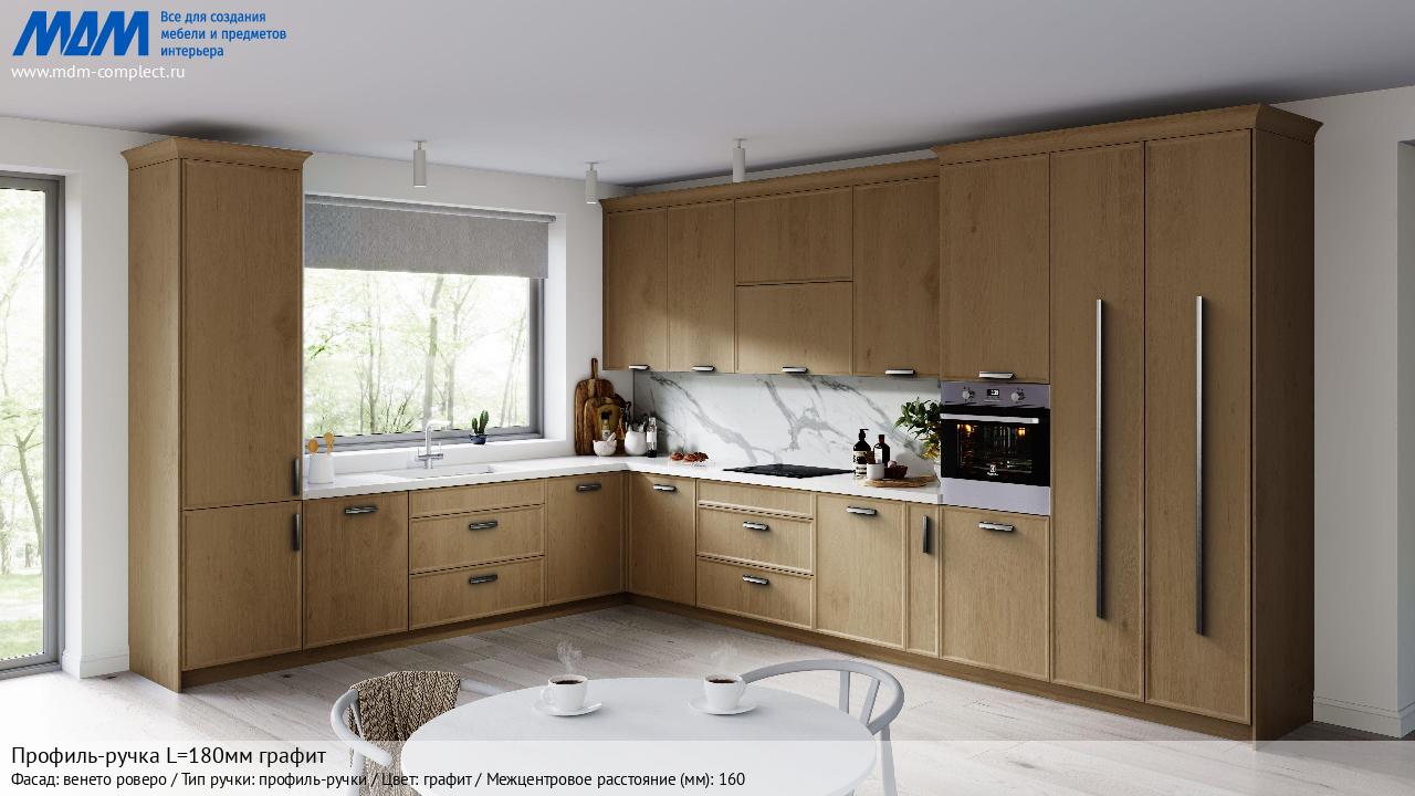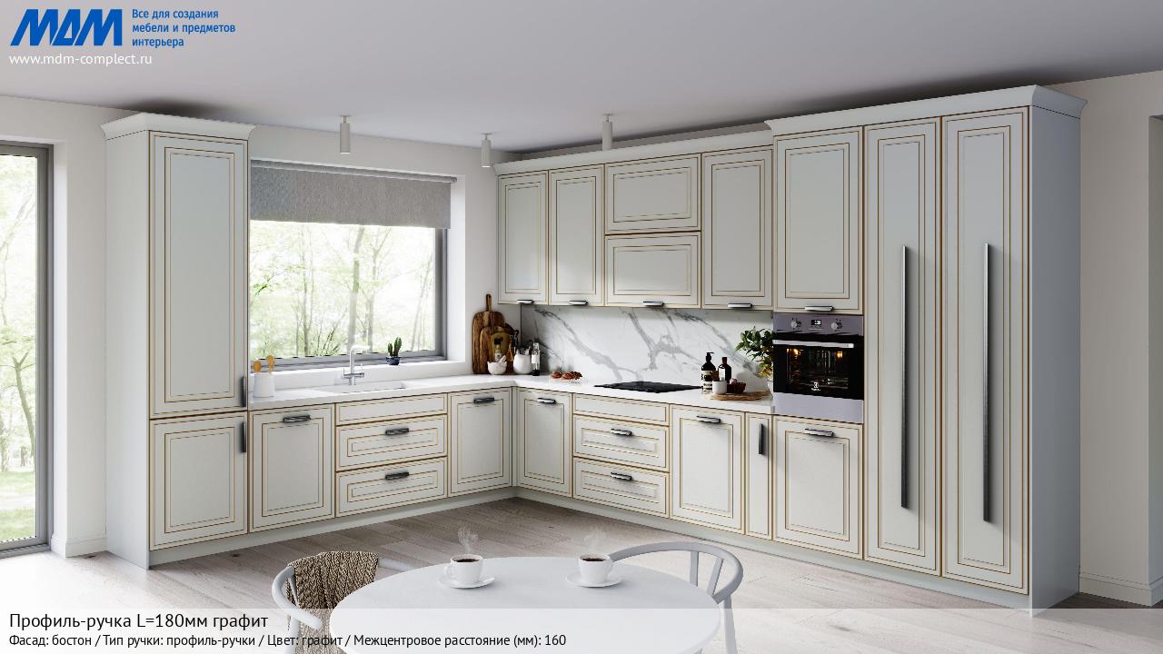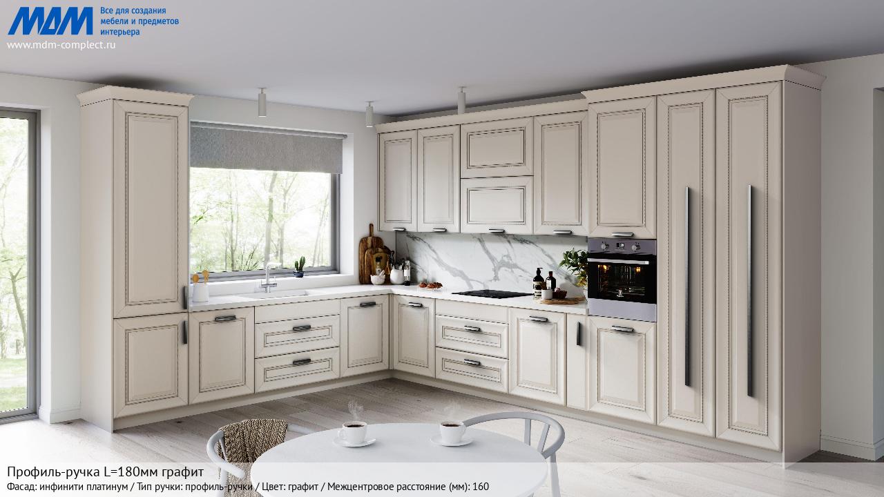 Мебельная Профиль-ручка L=180мм графит на различных фасадах в кухонном интерьере в стиле классика, лофт, модерн.