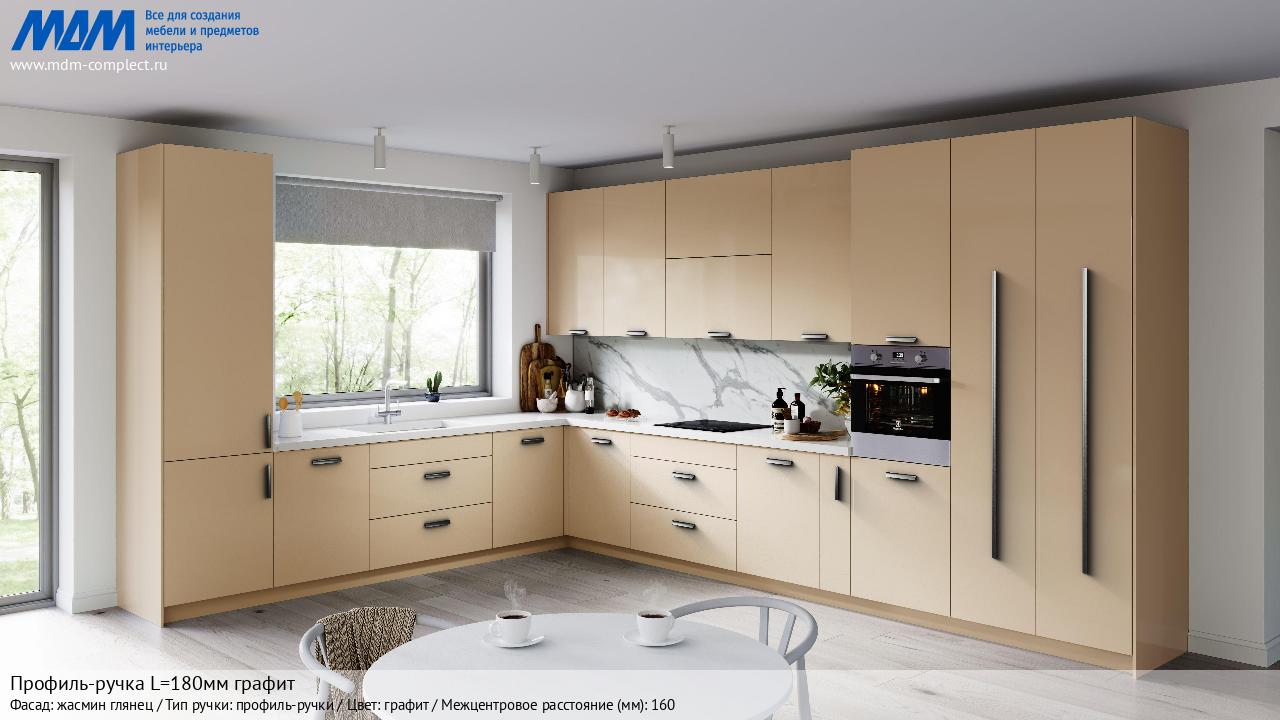 Профиль-ручка L=180мм графит (3252.180.9712) в готовой кухне на различных фасадах