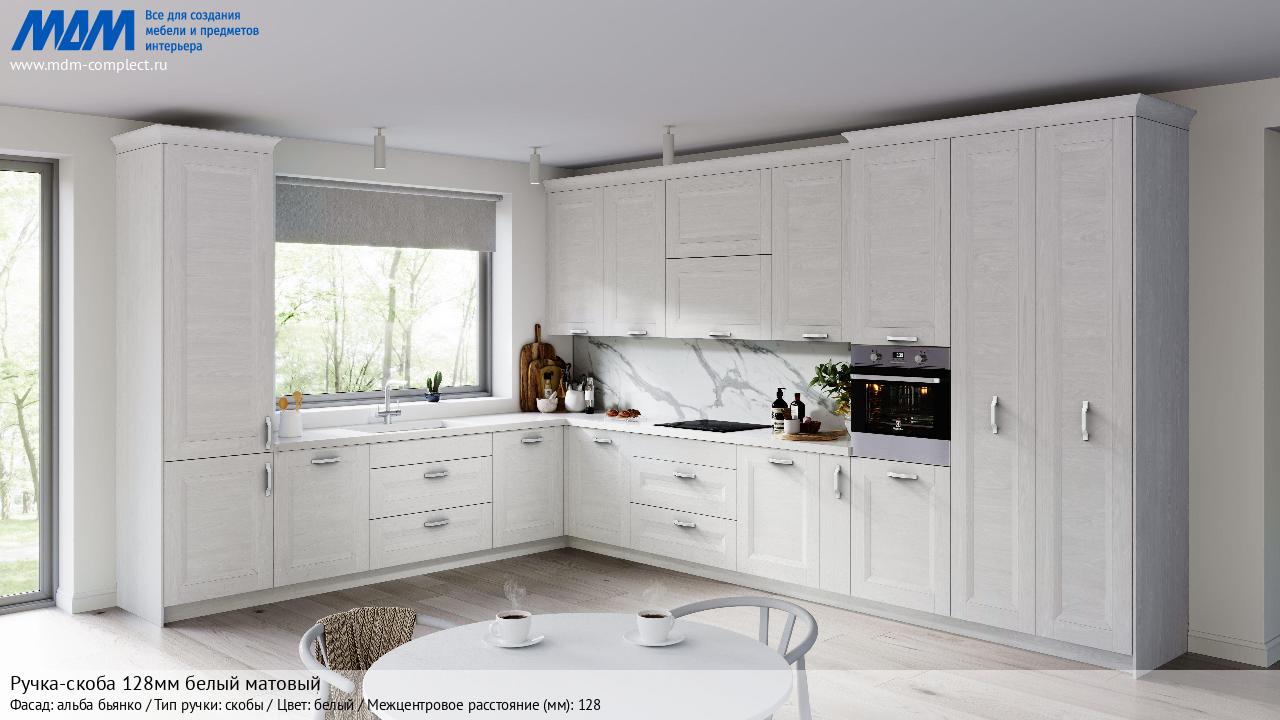 Мебельная Ручка-скоба 128мм белый матовый на различных фасадах в кухонном интерьере в стиле классика, лофт, модерн.