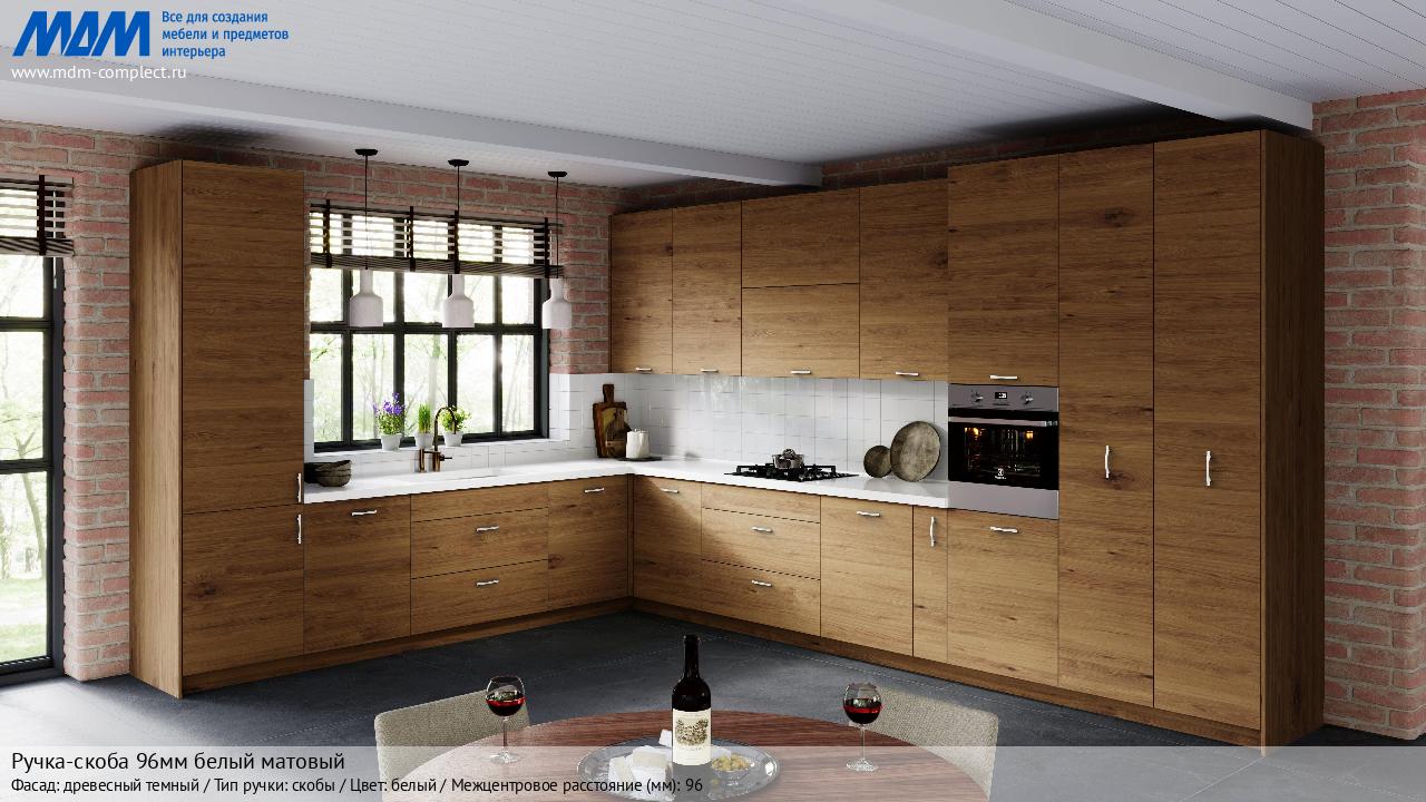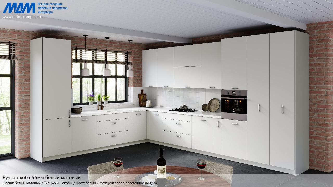Мебельная Ручка-скоба 96мм белый матовый на различных фасадах в кухонном интерьере в стиле классика, лофт, модерн.