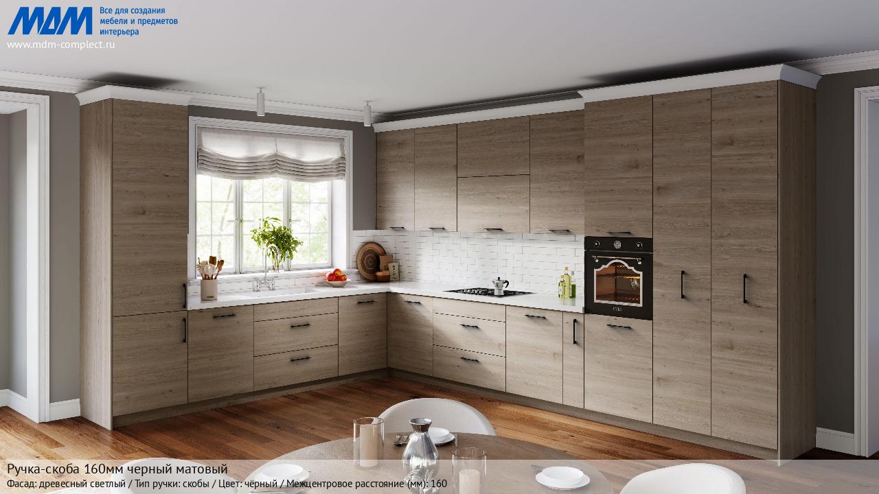 Мебельная Ручка-скоба 160мм черный матовый на различных фасадах в кухонном интерьере в стиле классика, лофт, модерн.