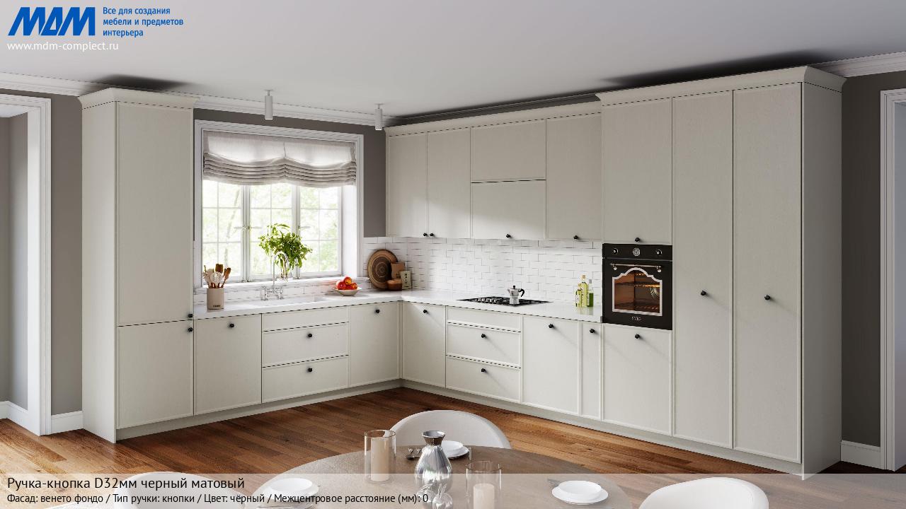 Мебельная Ручка-кнопка D32мм черный матовый на различных фасадах в кухонном интерьере в стиле классика, лофт, модерн.