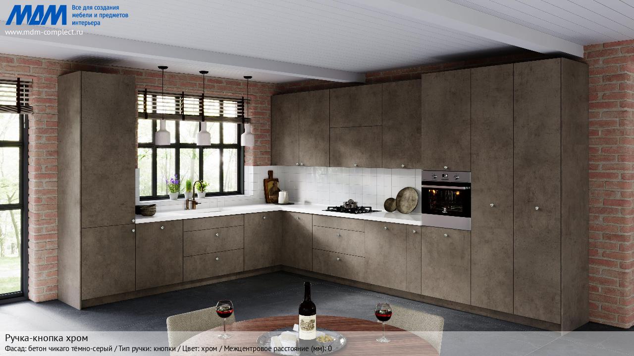 Мебельная Ручка-кнопка хром на различных фасадах в кухонном интерьере в стиле классика, лофт, модерн.