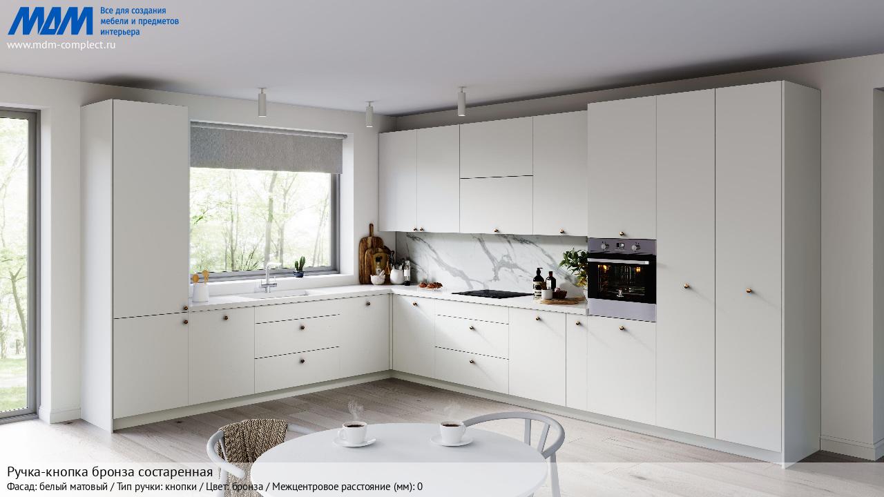 Мебельная Ручка-кнопка бронза состаренная на различных фасадах в кухонном интерьере в стиле классика, лофт, модерн.