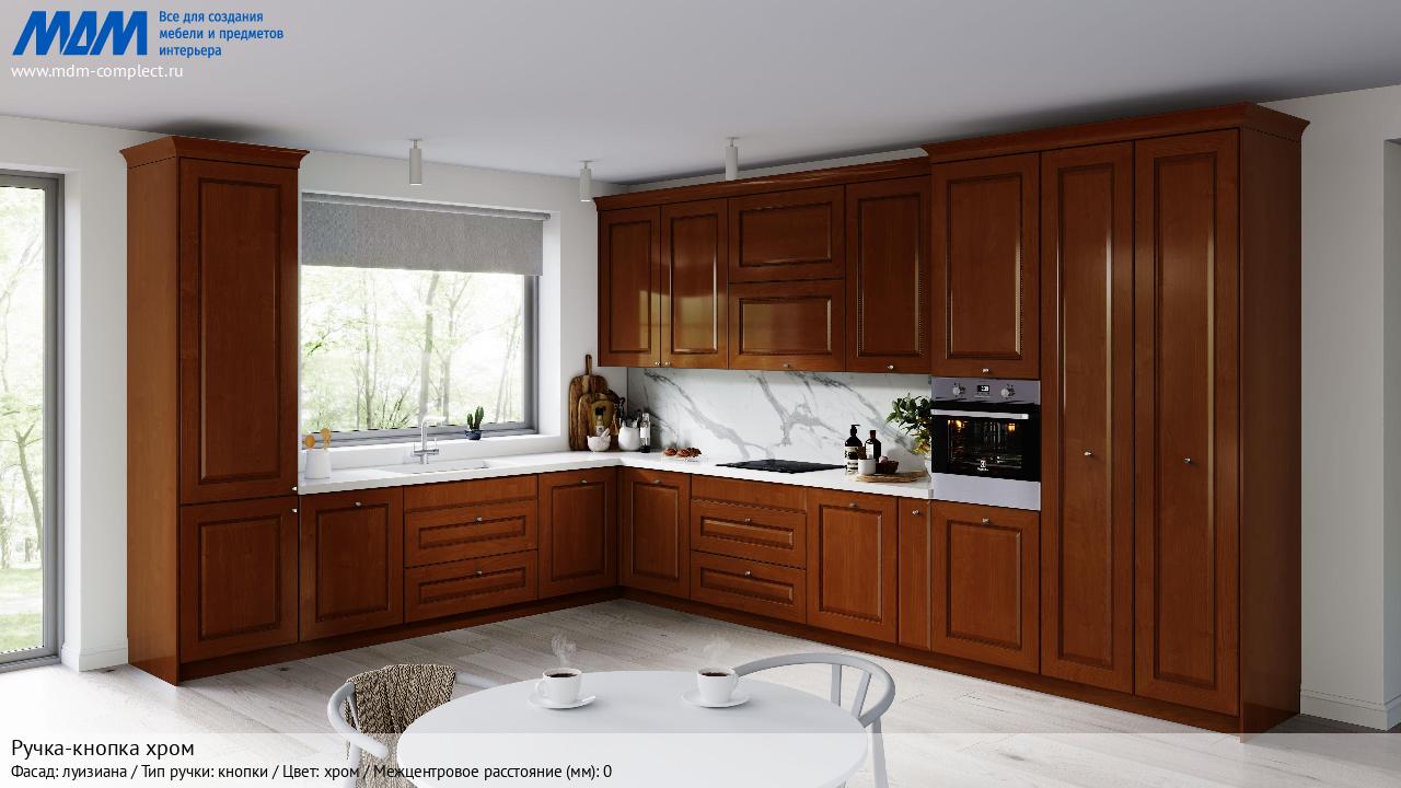 Мебельная Ручка-кнопка хром на различных фасадах в кухонном интерьере в стиле классика, лофт, модерн.
