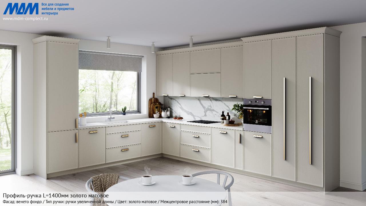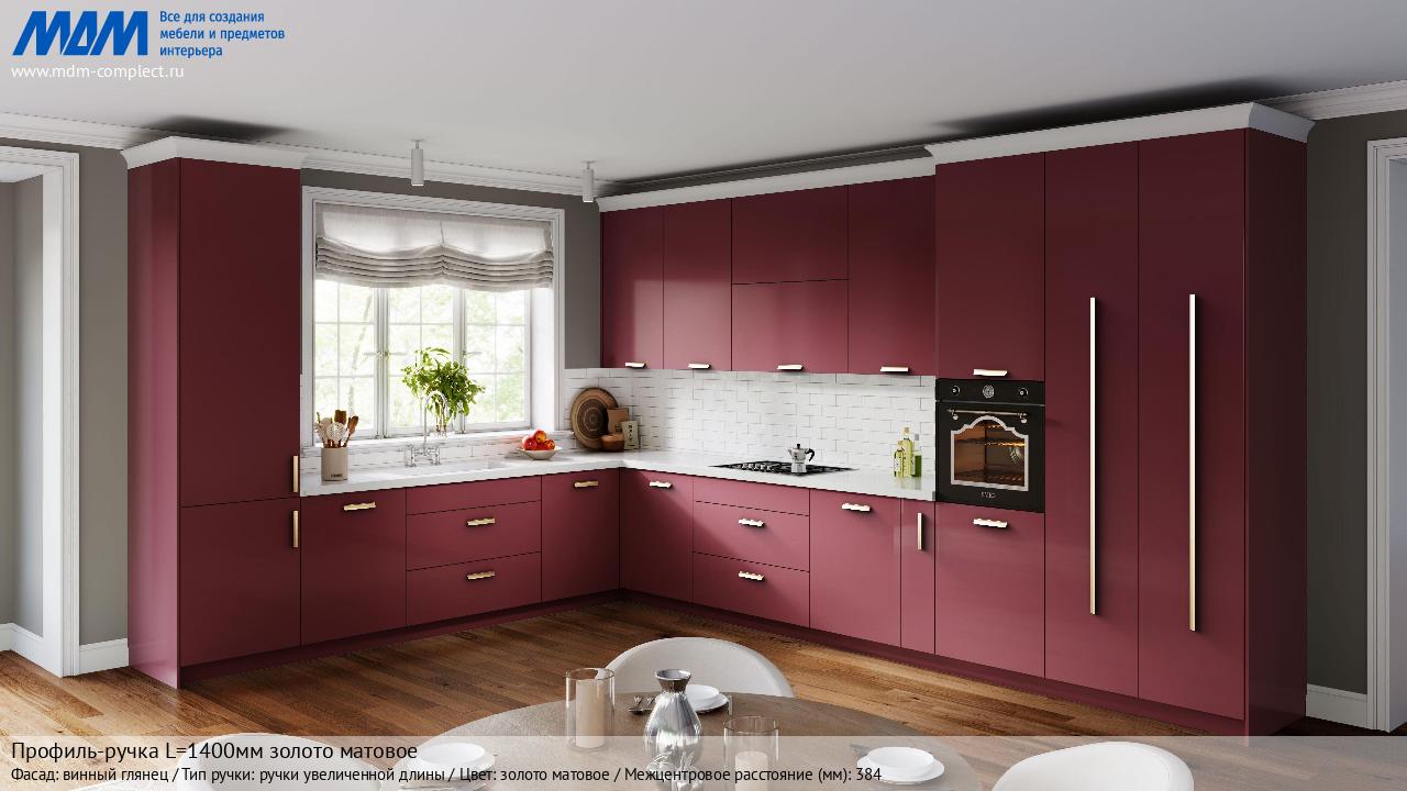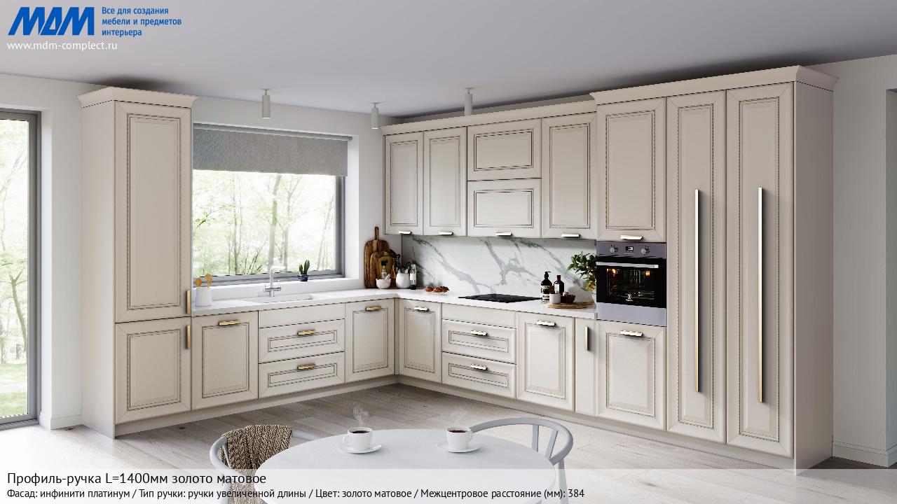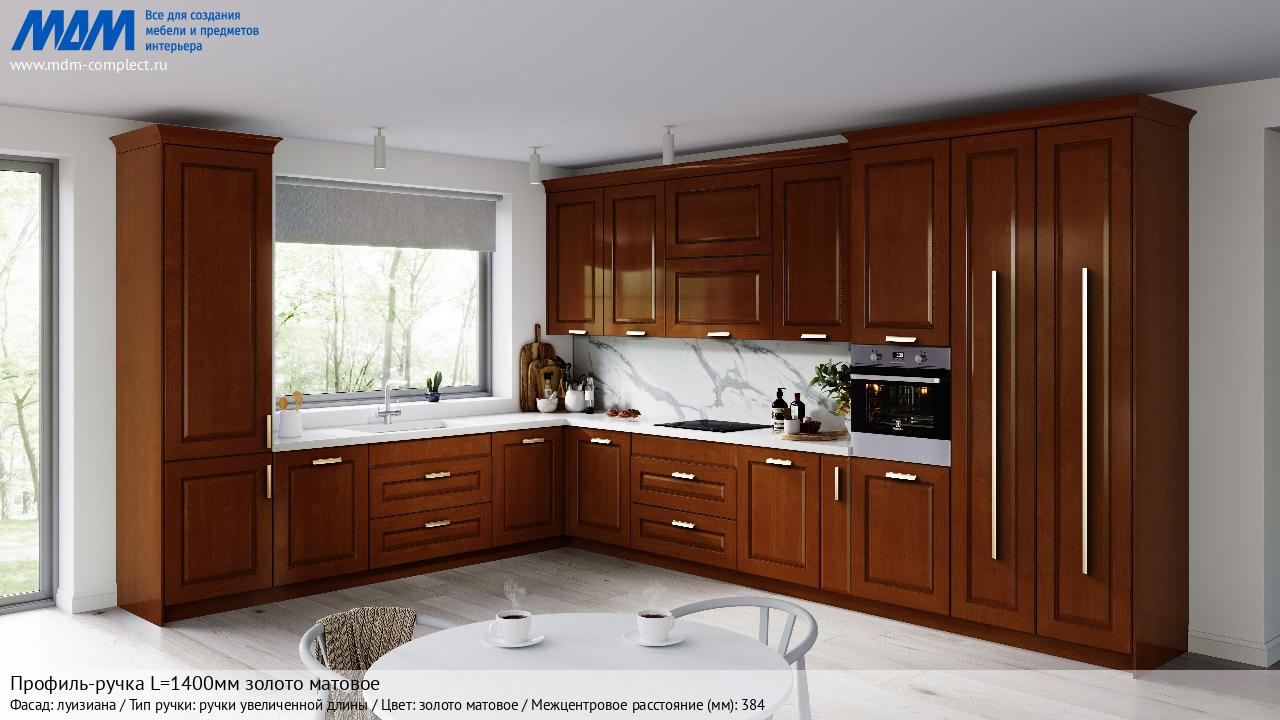 Мебельная Профиль-ручка L=1400мм золото матовое на различных фасадах в кухонном интерьере в стиле классика, лофт, модерн.