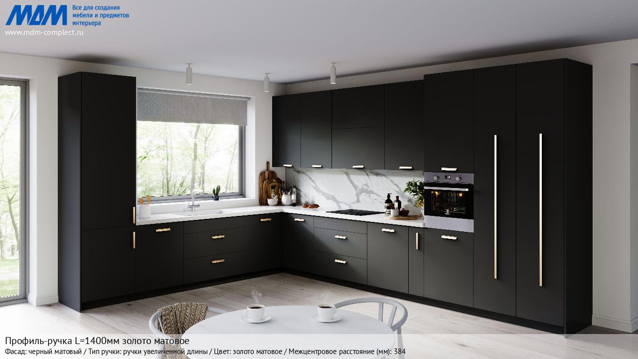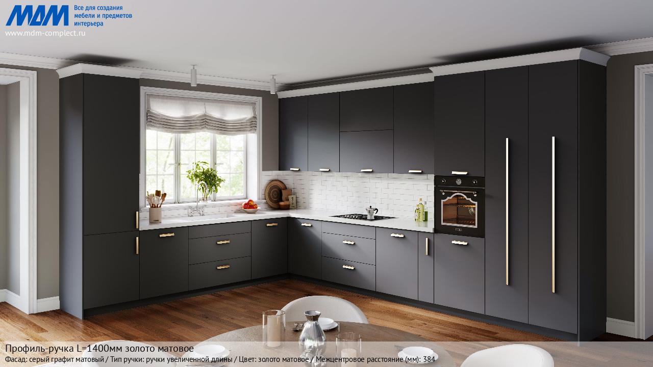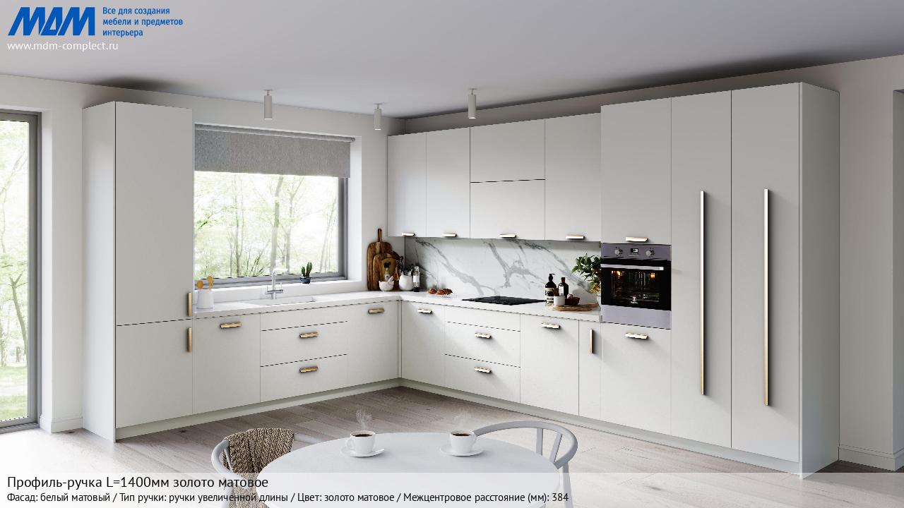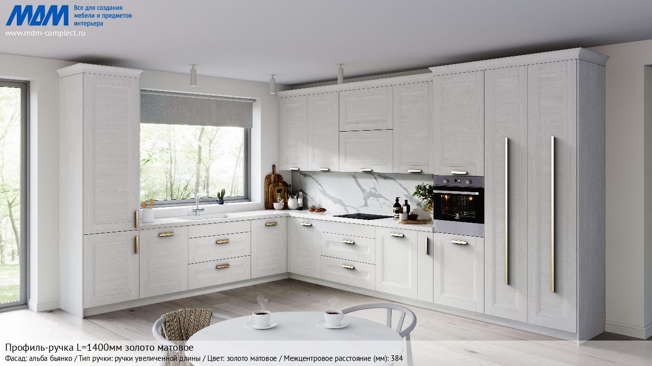 Мебельная Профиль-ручка L=1400мм золото матовое на различных фасадах в кухонном интерьере в стиле классика, лофт, модерн.