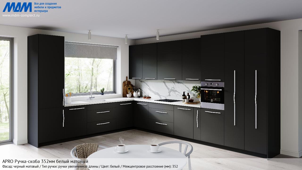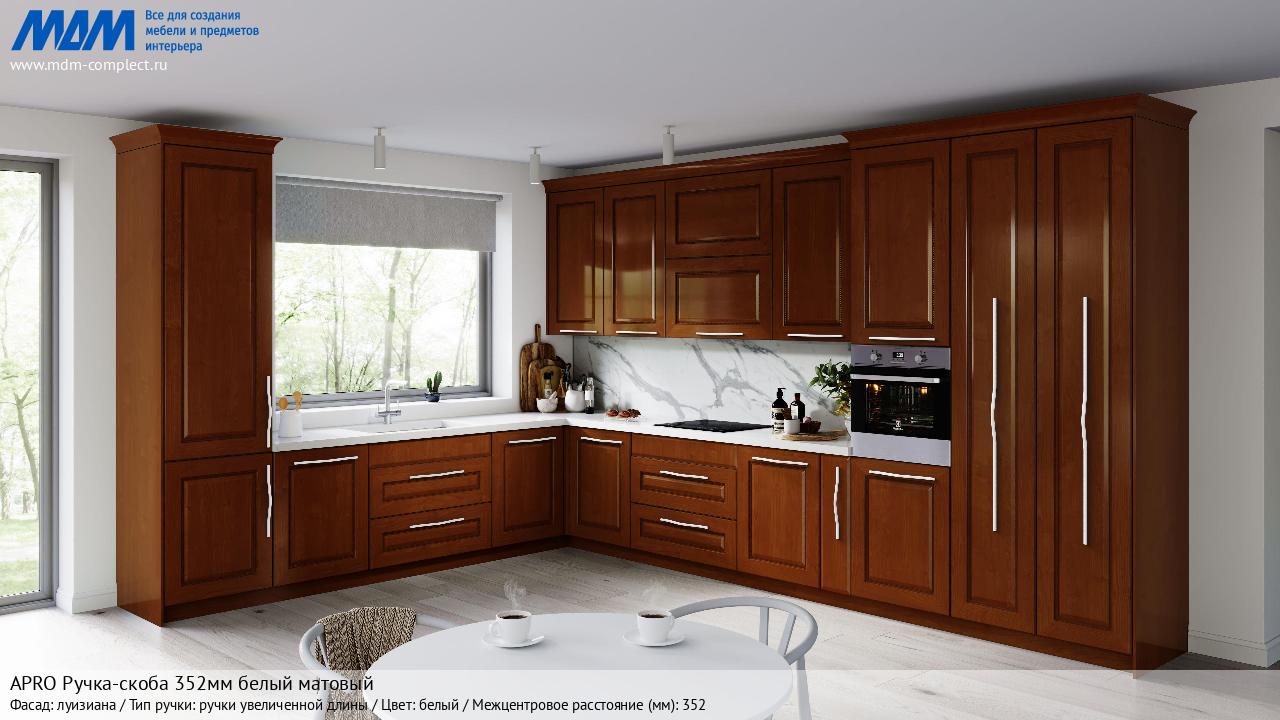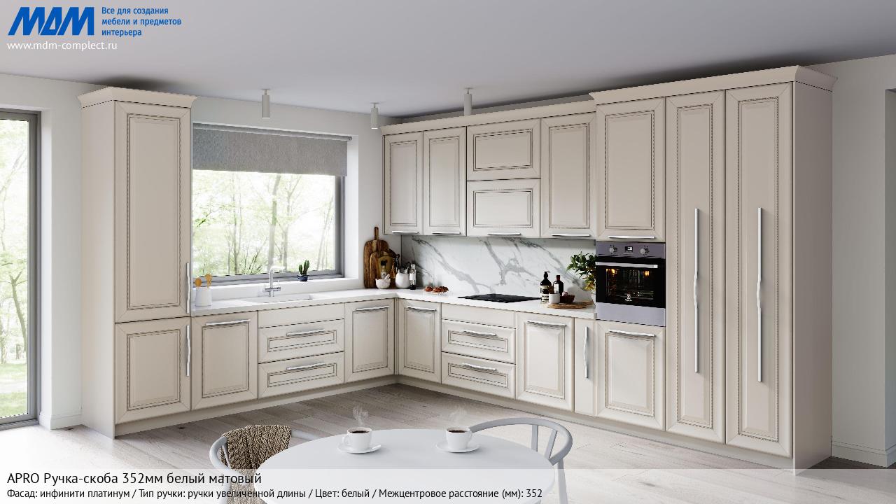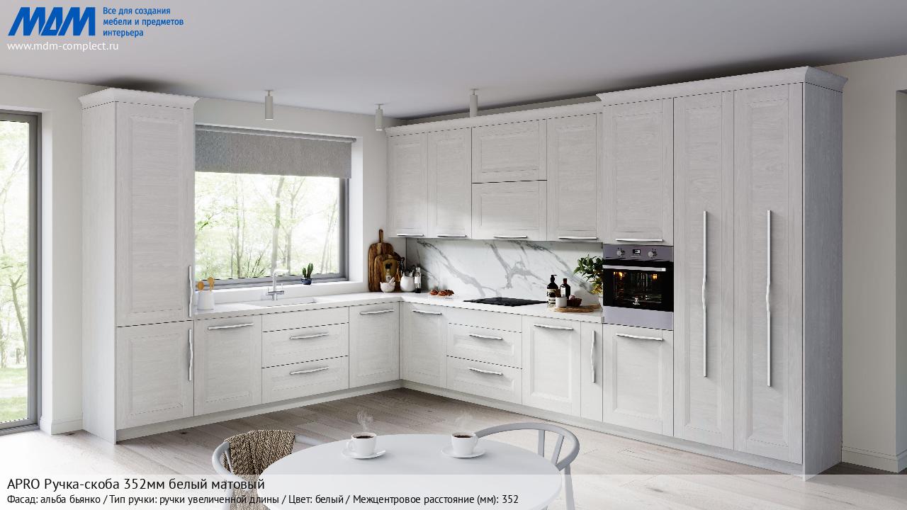 Мебельная APRO Ручка-скоба 352мм белый матовый на различных фасадах в кухонном интерьере в стиле классика, лофт, модерн.