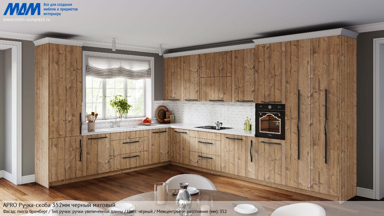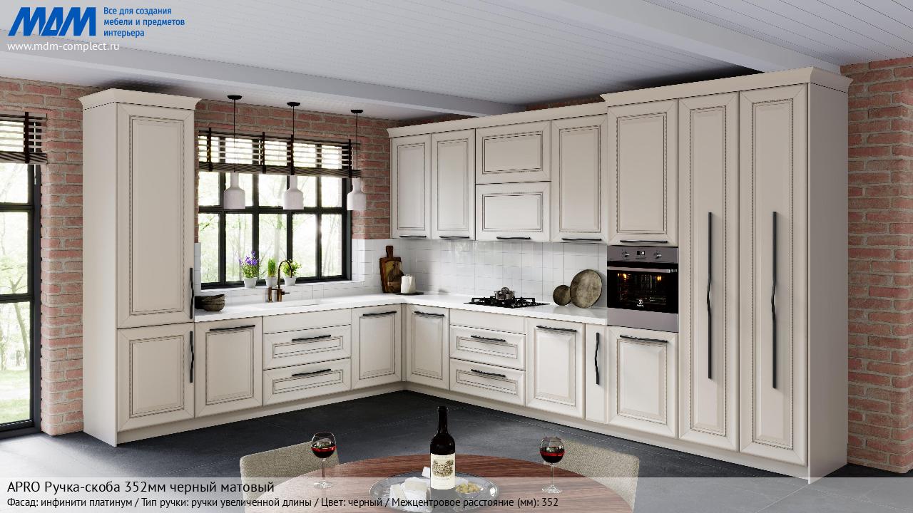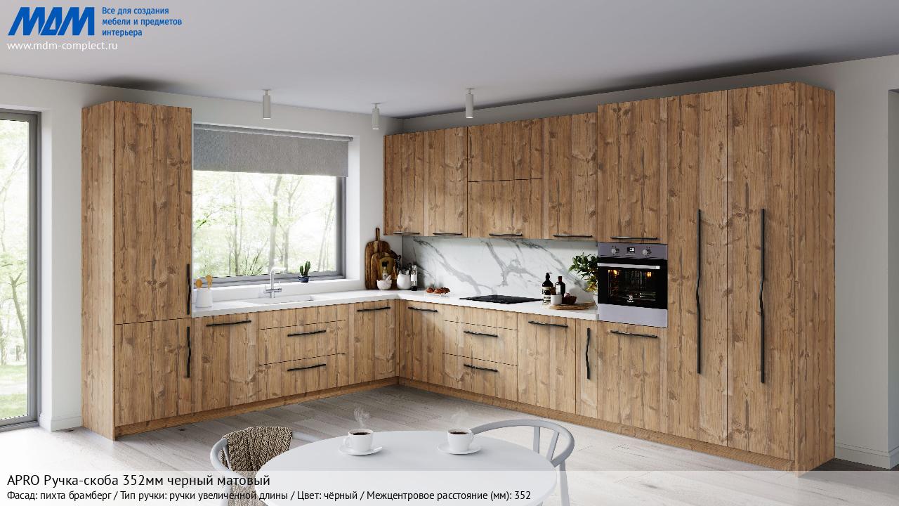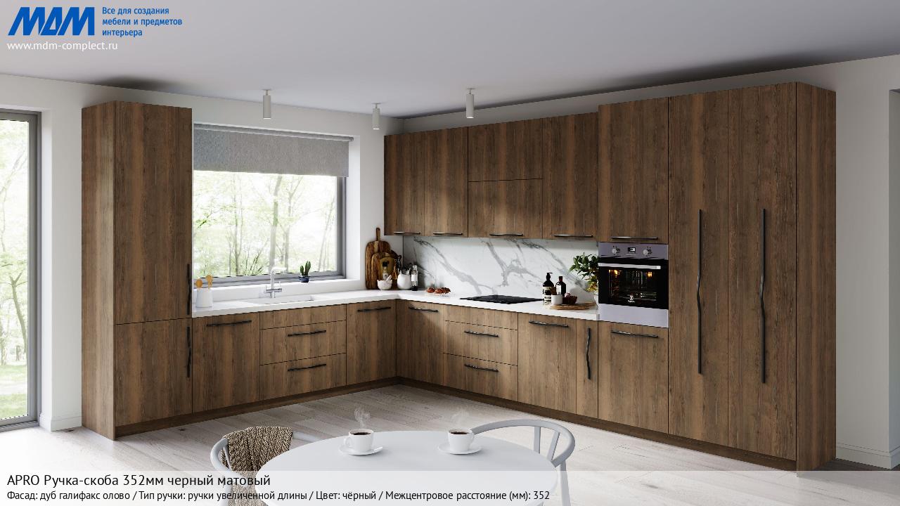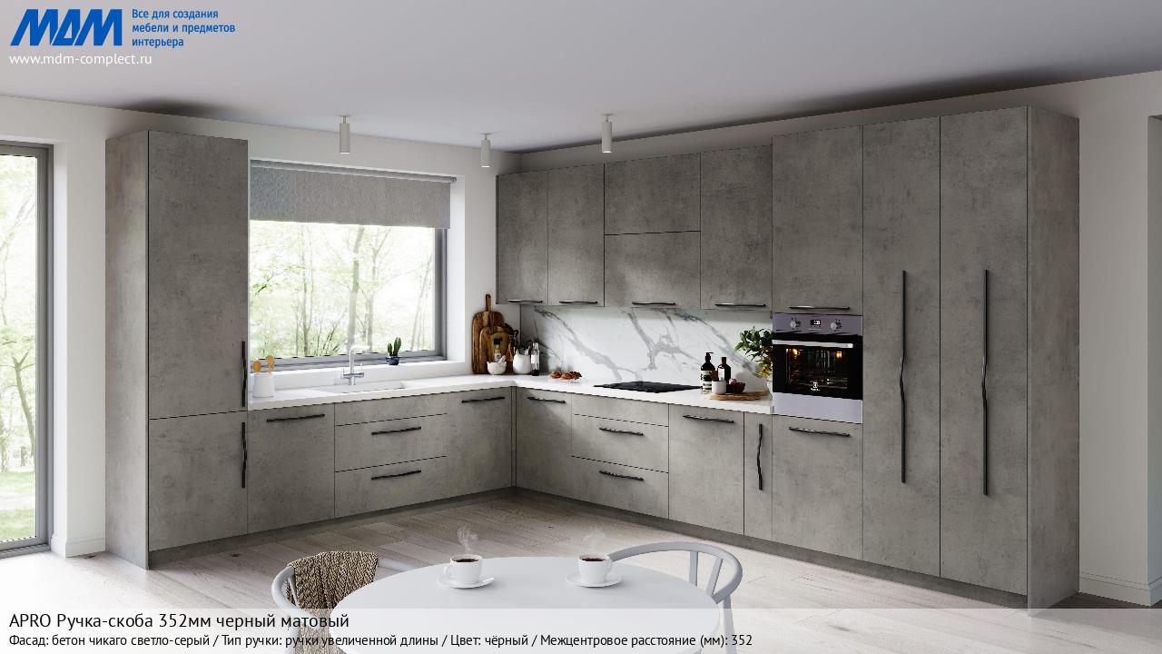 Мебельная APRO Ручка-скоба 352мм черный матовый на различных фасадах в кухонном интерьере в стиле классика, лофт, модерн.