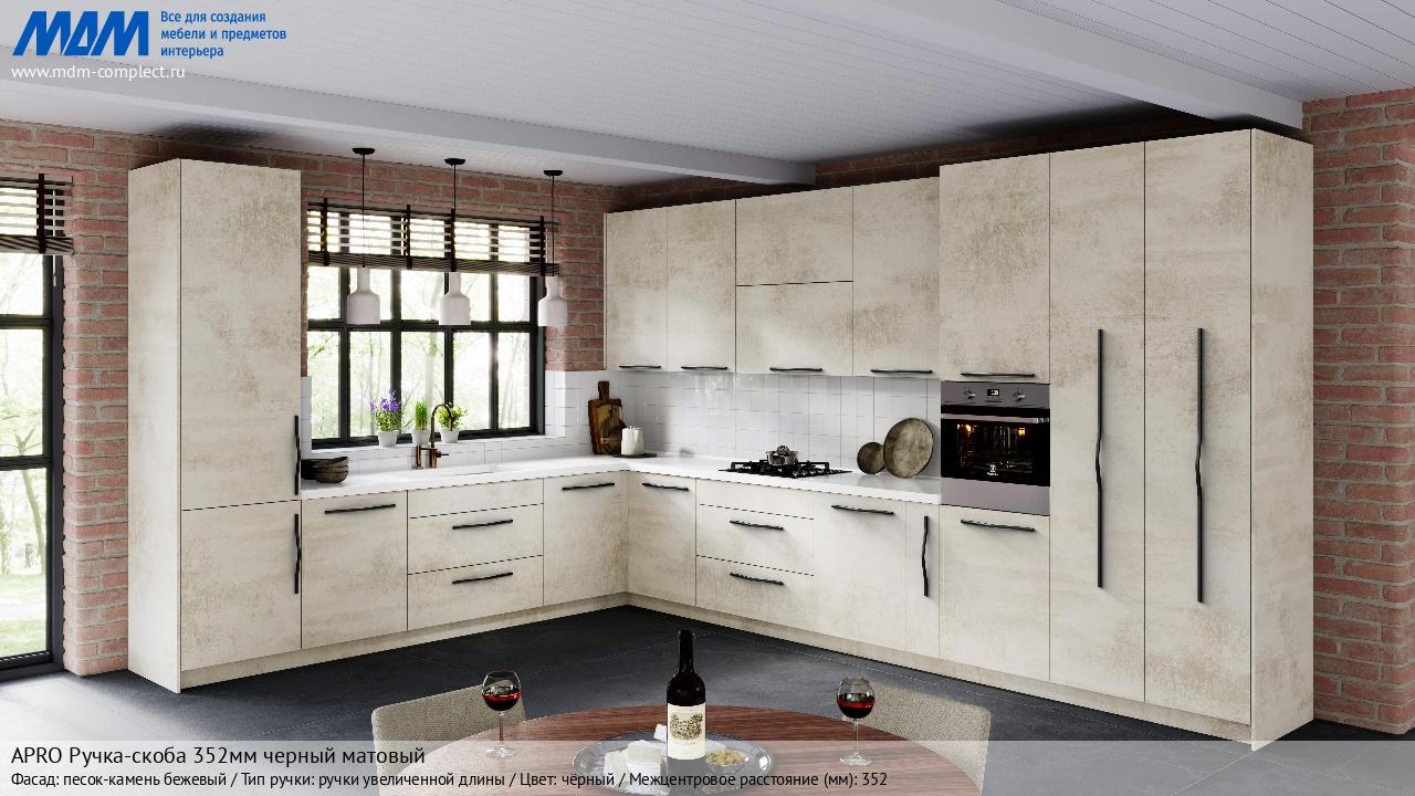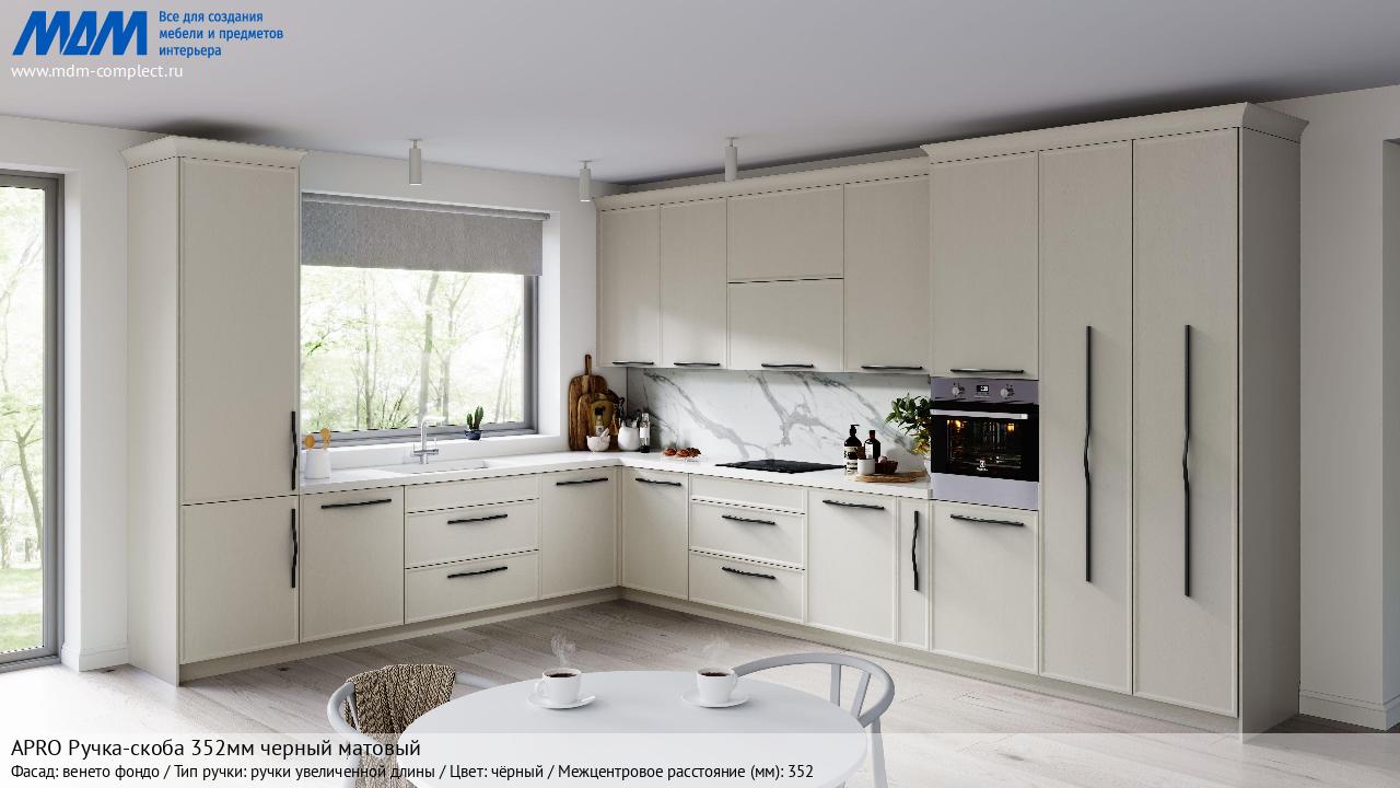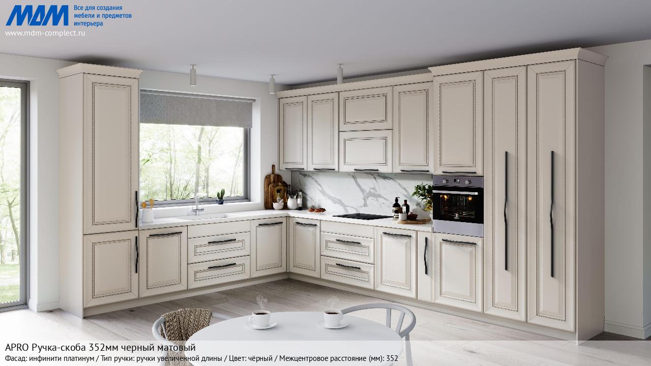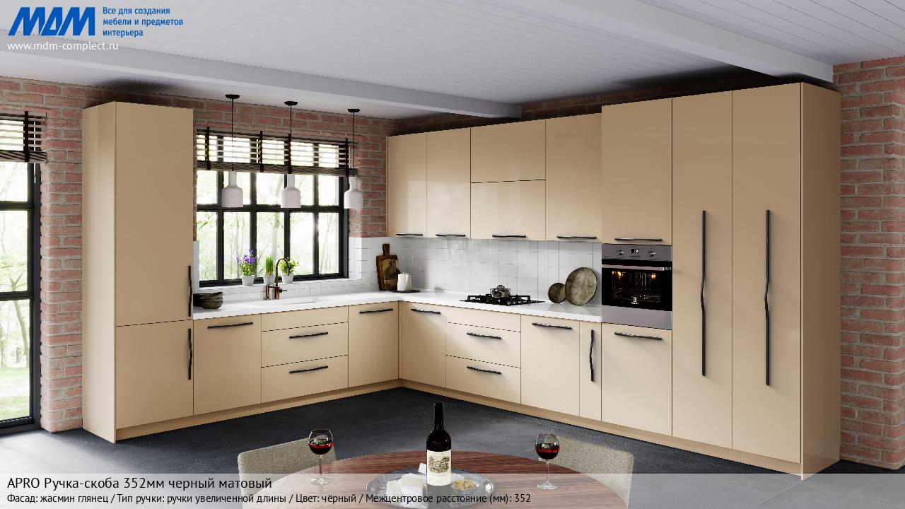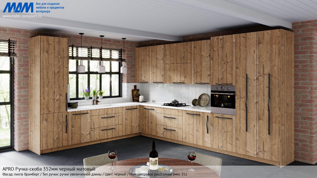 Мебельная APRO Ручка-скоба 352мм черный матовый на различных фасадах в кухонном интерьере в стиле классика, лофт, модерн.