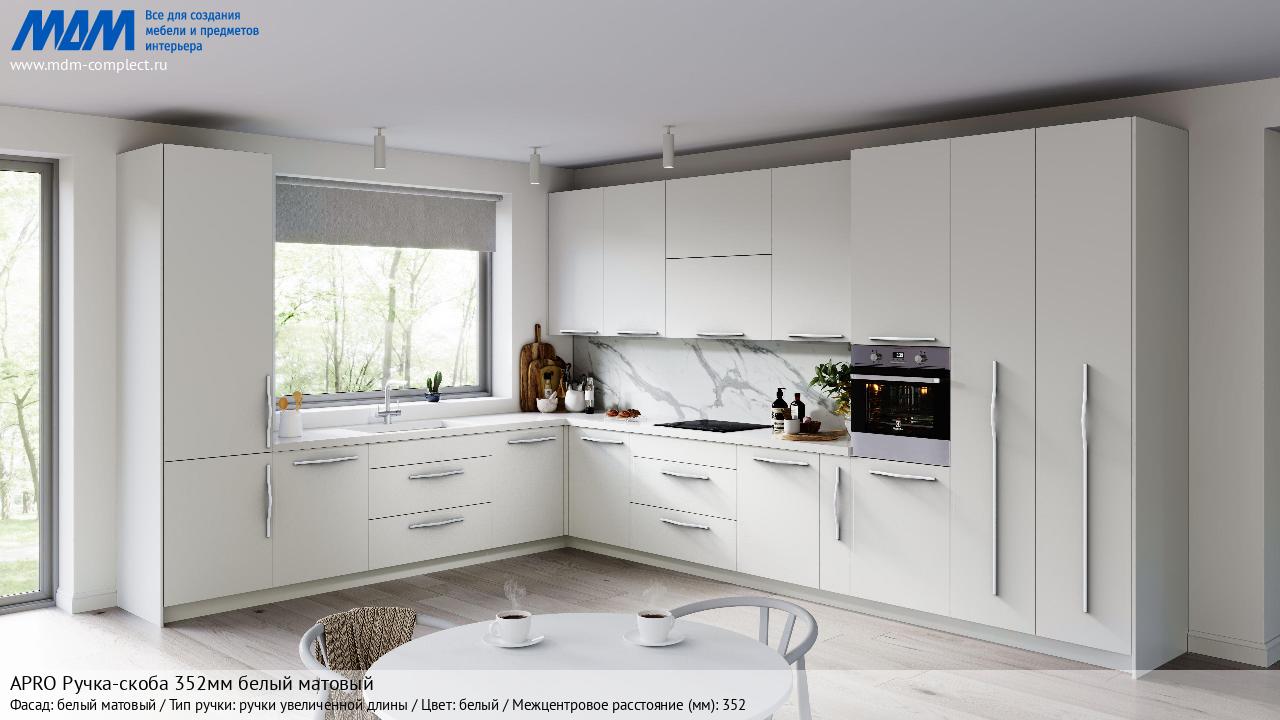 Мебельная APRO Ручка-скоба 352мм белый матовый на различных фасадах в кухонном интерьере в стиле классика, лофт, модерн.