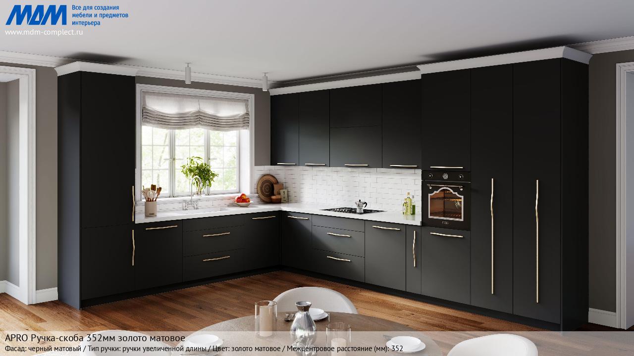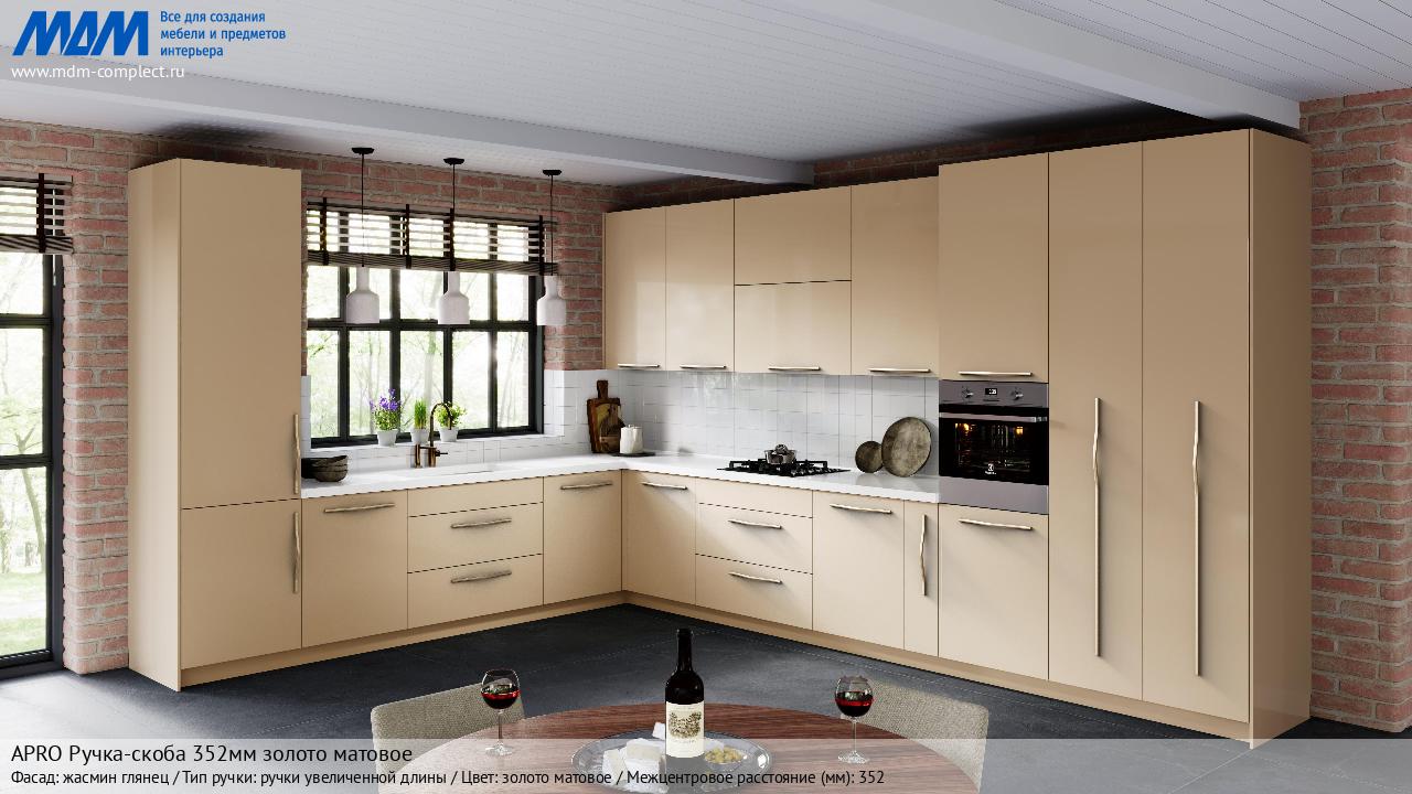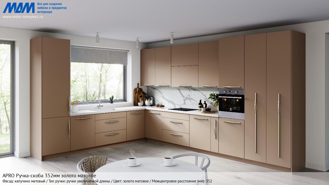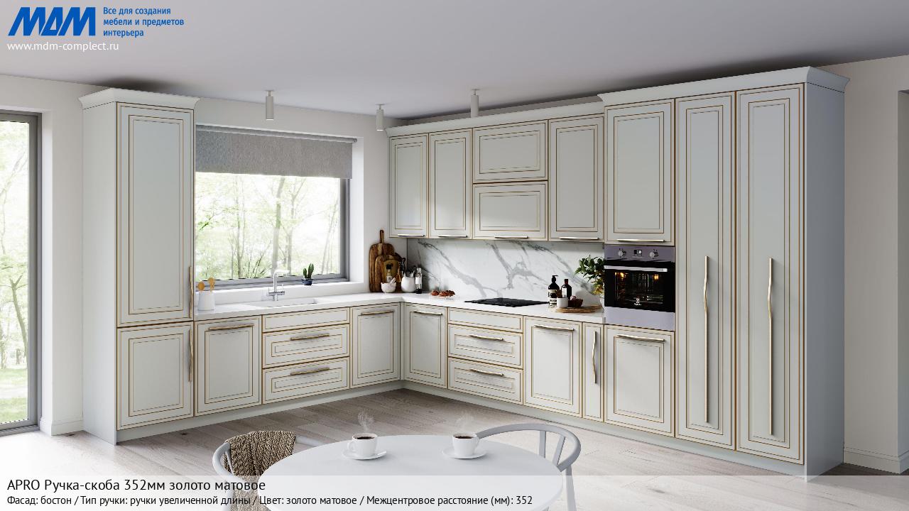 Мебельная APRO Ручка-скоба 352мм золото матовое на различных фасадах в кухонном интерьере в стиле классика, лофт, модерн.