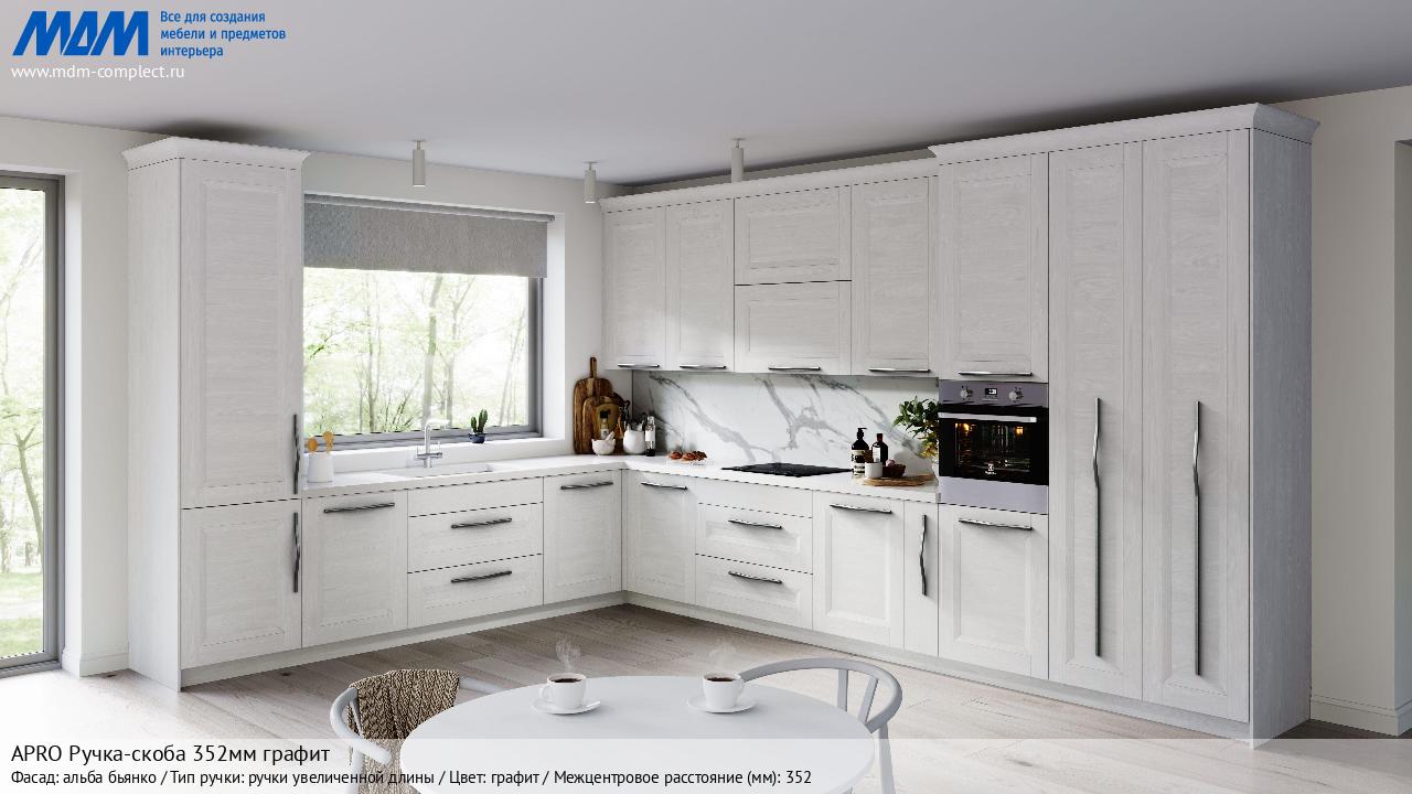 Мебельная APRO Ручка-скоба 352мм графит на различных фасадах в кухонном интерьере в стиле классика, лофт, модерн.