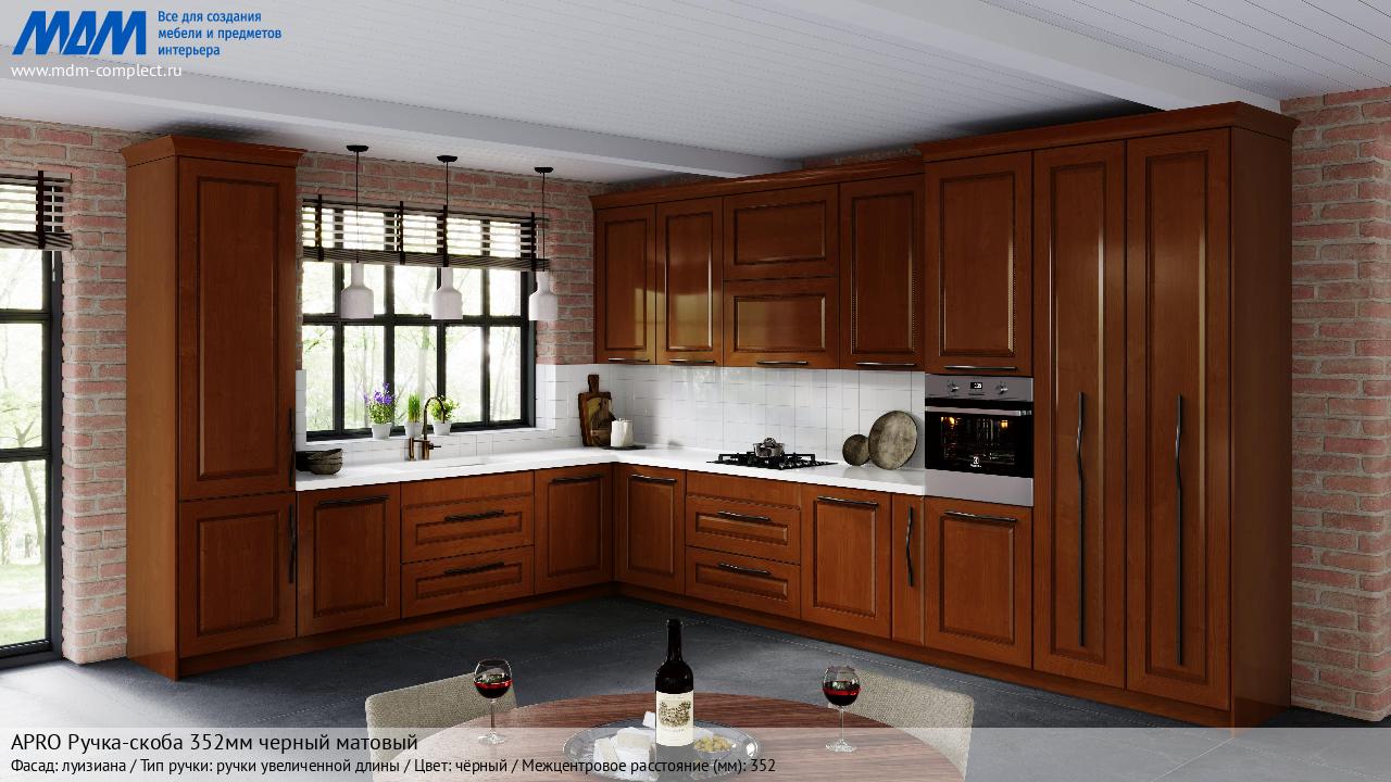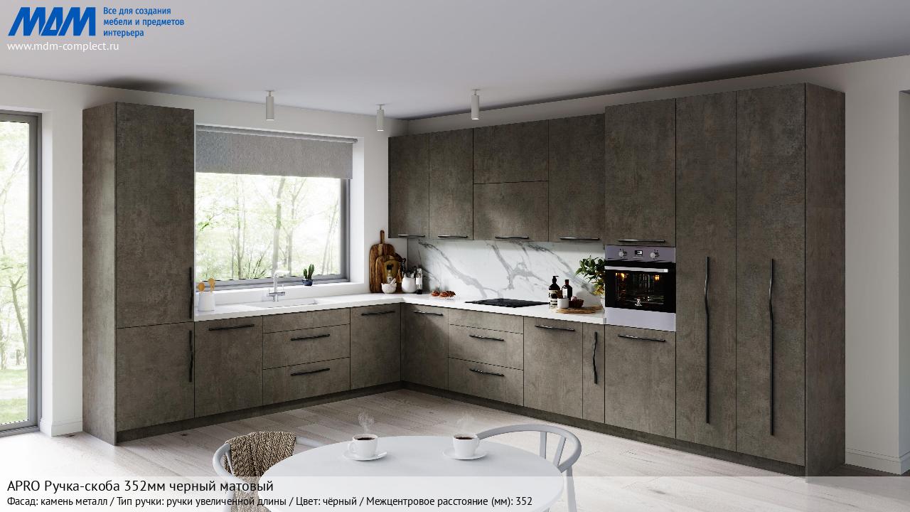 Мебельная APRO Ручка-скоба 352мм черный матовый на различных фасадах в кухонном интерьере в стиле классика, лофт, модерн.