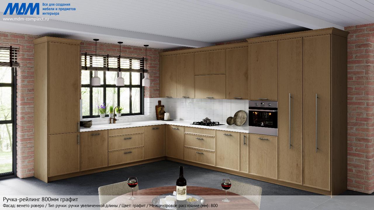 Мебельная Ручка-рейлинг 800мм графит на различных фасадах в кухонном интерьере в стиле классика, лофт, модерн.