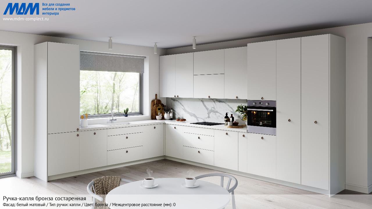 Мебельная Ручка-капля бронза состаренная на различных фасадах в кухонном интерьере в стиле классика, лофт, модерн.