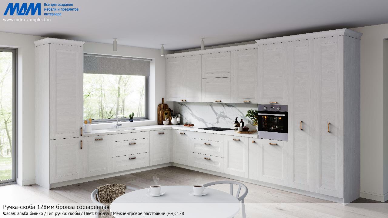 Мебельная Ручка-скоба 128мм бронза состаренная на различных фасадах в кухонном интерьере в стиле классика, лофт, модерн.