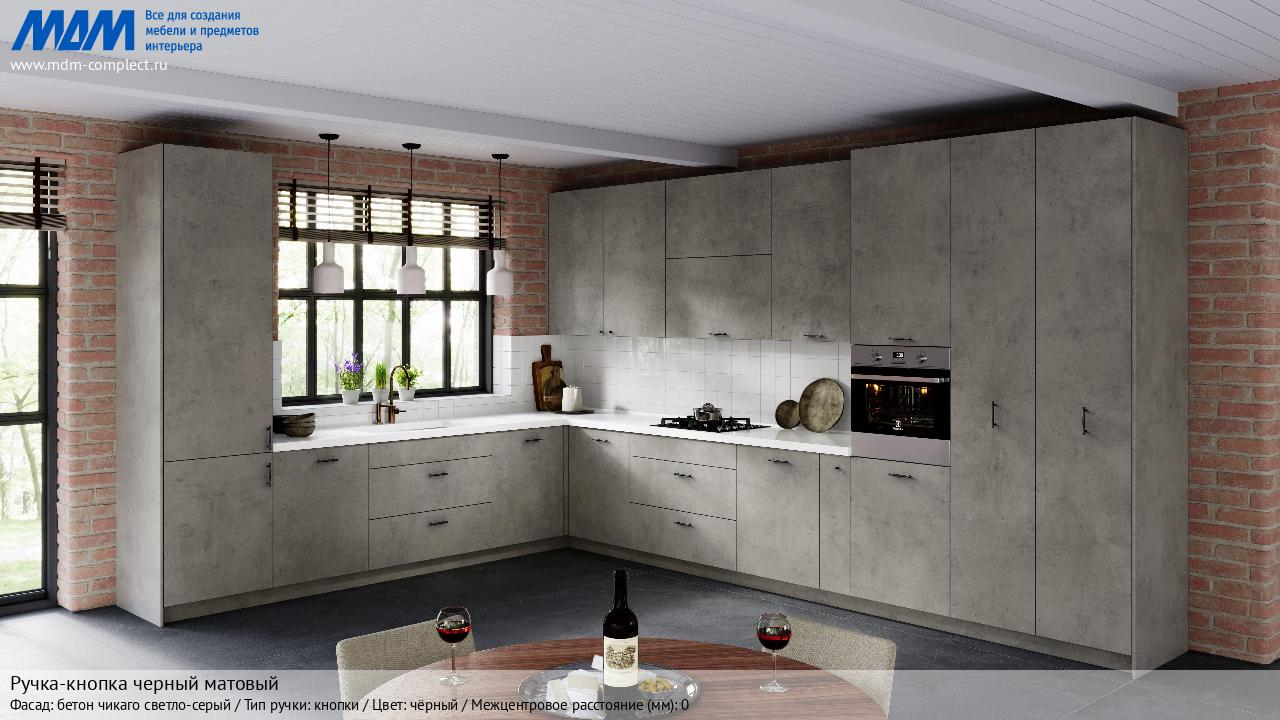 Мебельная Ручка-кнопка черный матовый на различных фасадах в кухонном интерьере в стиле классика, лофт, модерн.