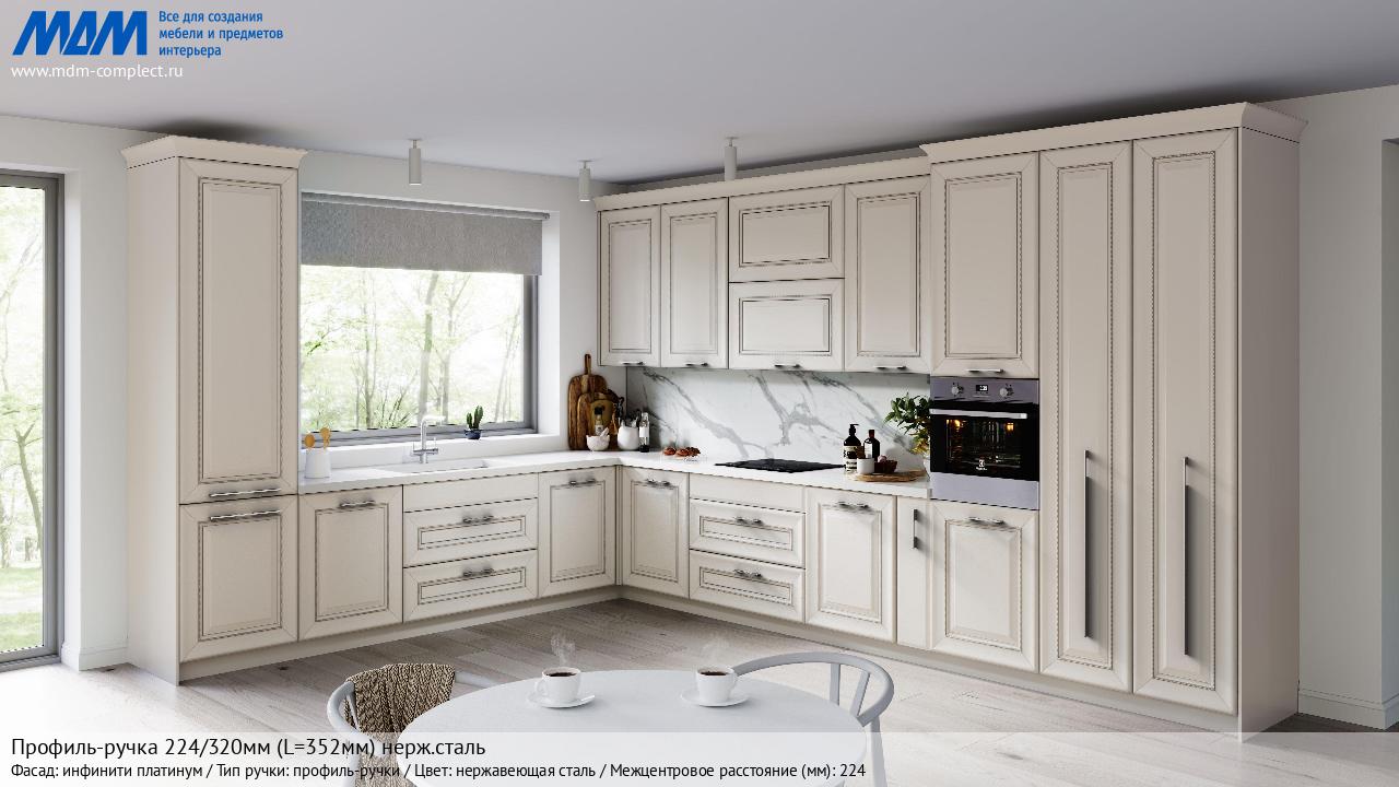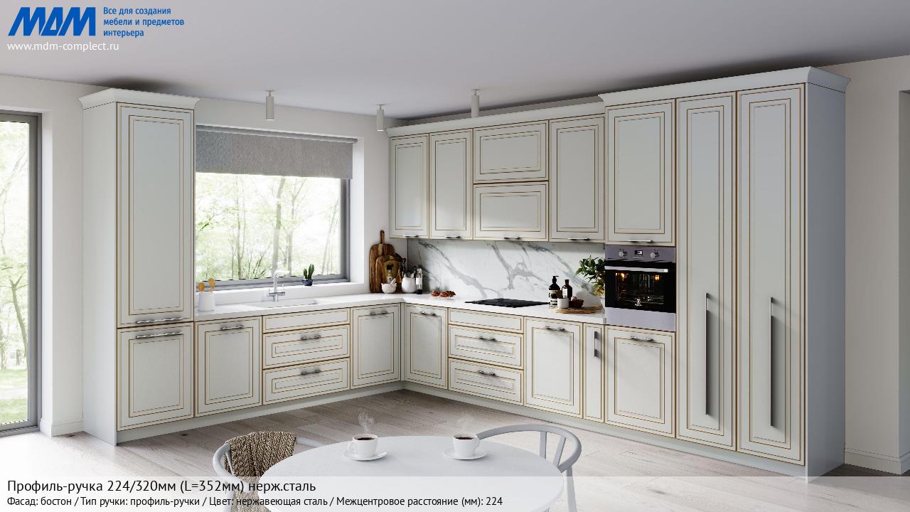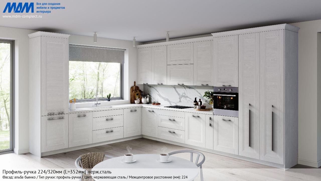 Мебельная Профиль-ручка 224/320мм (L=352мм) нерж.сталь на различных фасадах в кухонном интерьере в стиле классика, лофт, модерн.