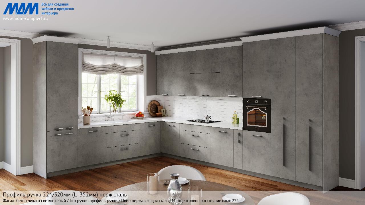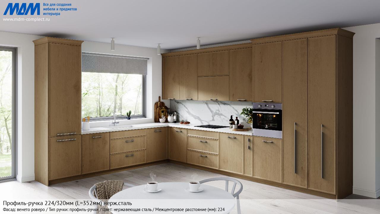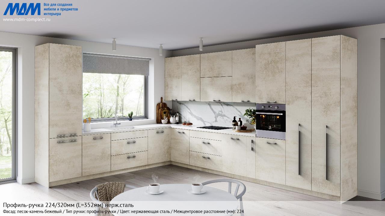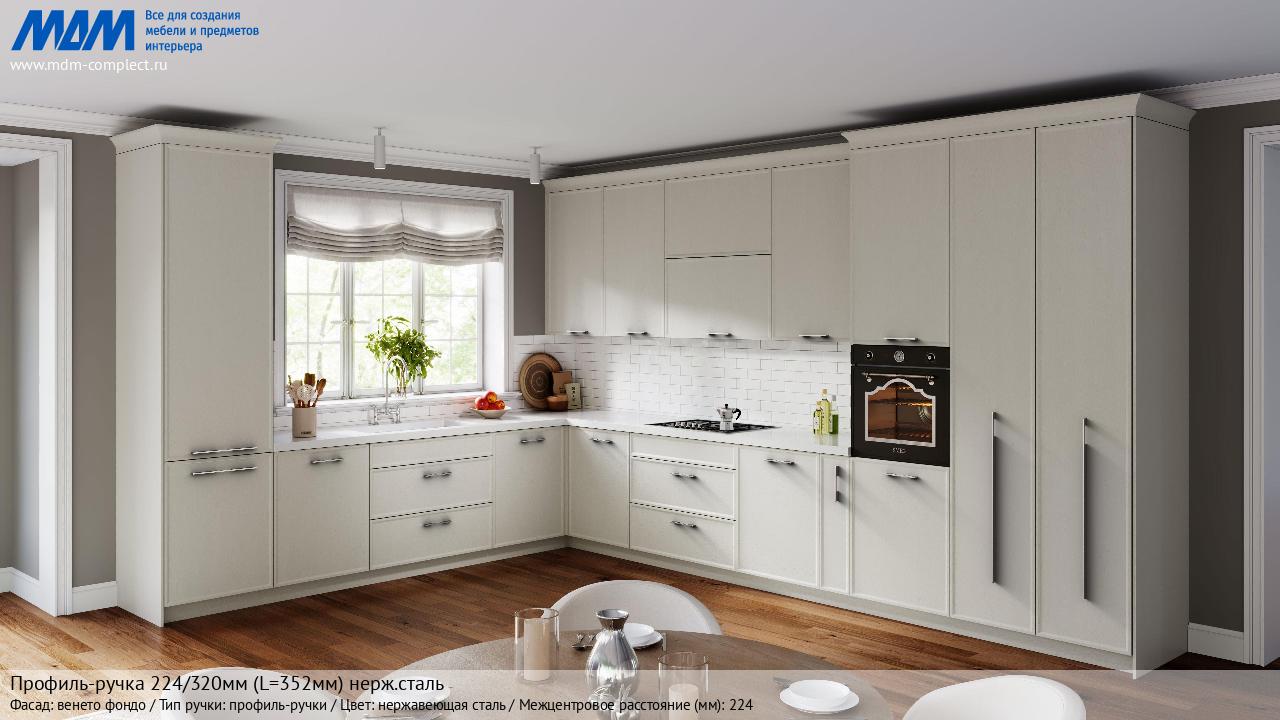 Мебельная Профиль-ручка 224/320мм (L=352мм) нерж.сталь на различных фасадах в кухонном интерьере в стиле классика, лофт, модерн.