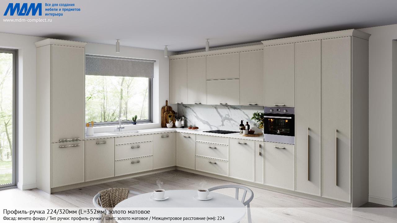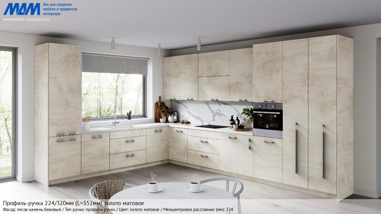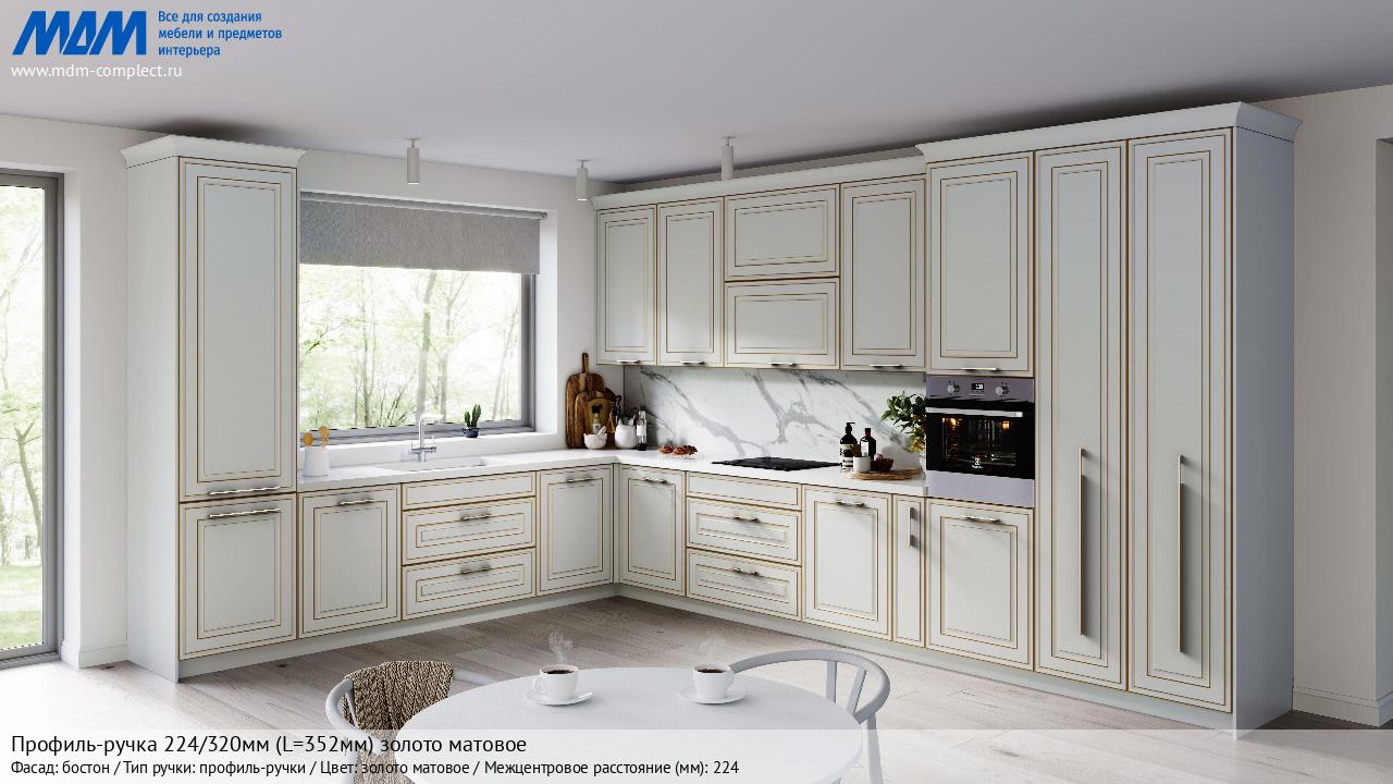Мебельная Профиль-ручка 224/320мм (L=352мм) золото матовое на различных фасадах в кухонном интерьере в стиле классика, лофт, модерн.