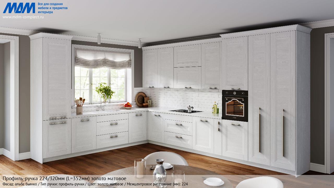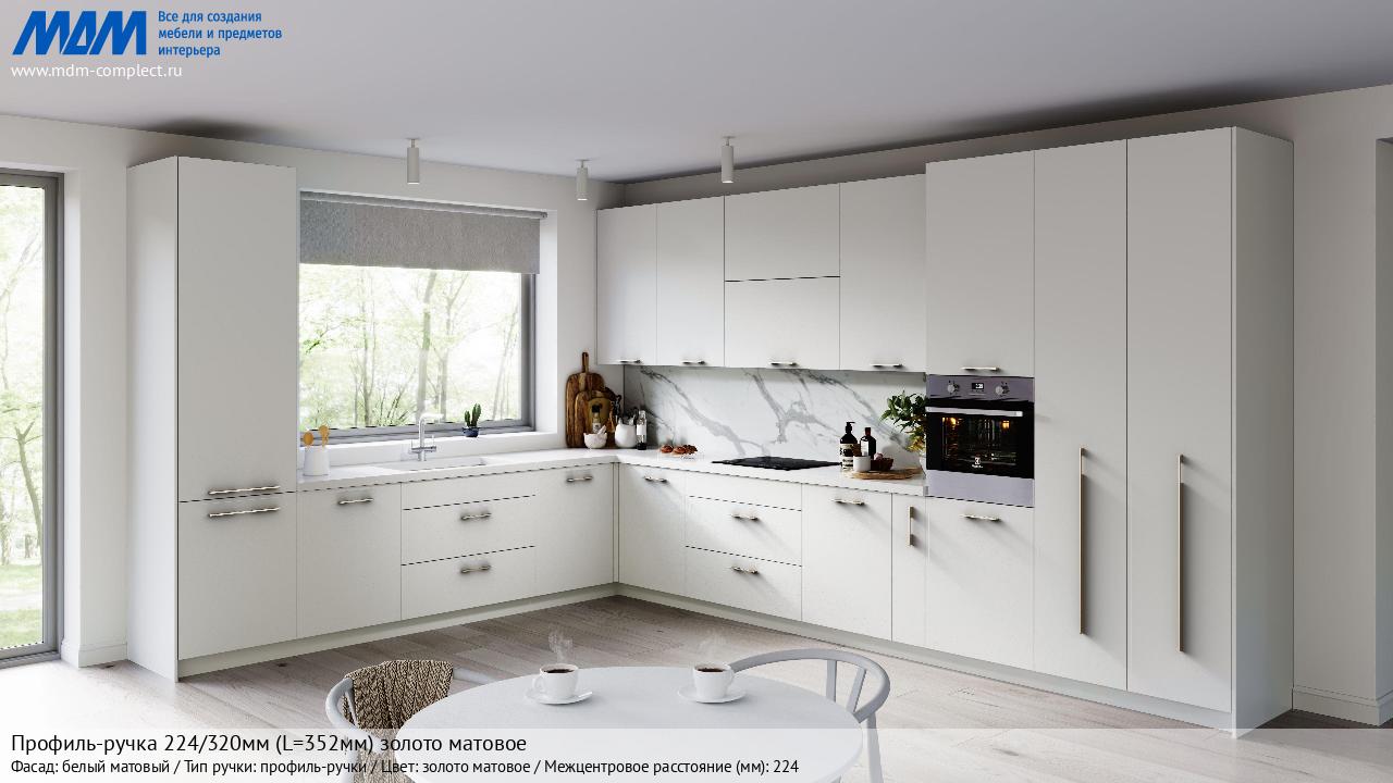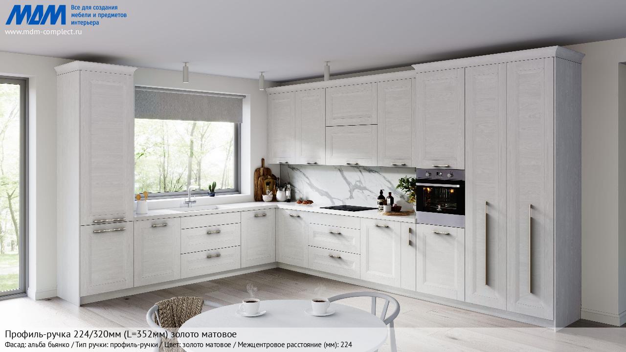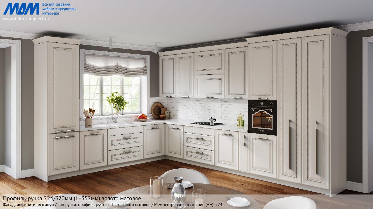 Мебельная Профиль-ручка 224/320мм (L=352мм) золото матовое на различных фасадах в кухонном интерьере в стиле классика, лофт, модерн.