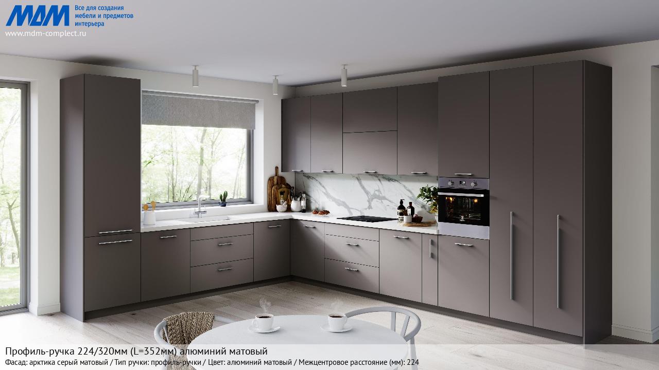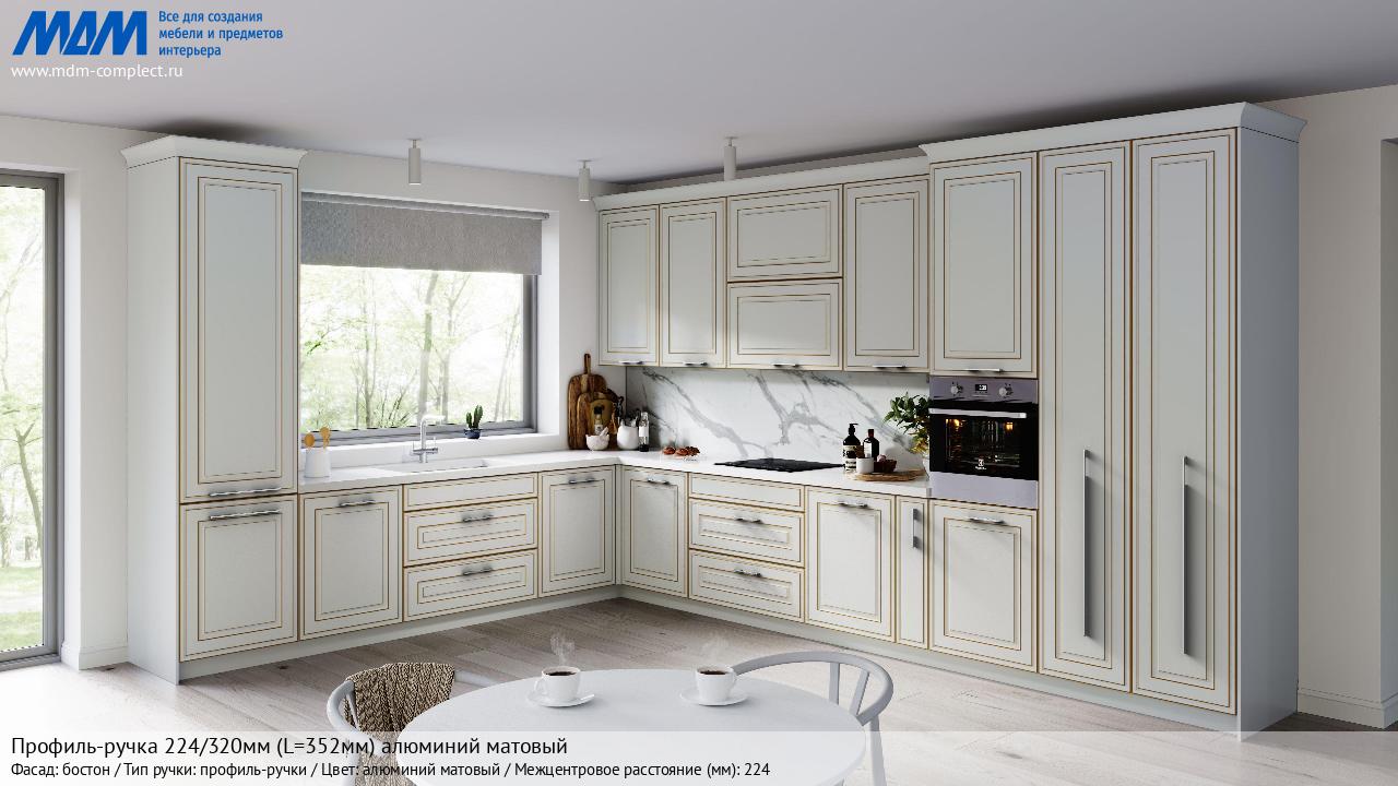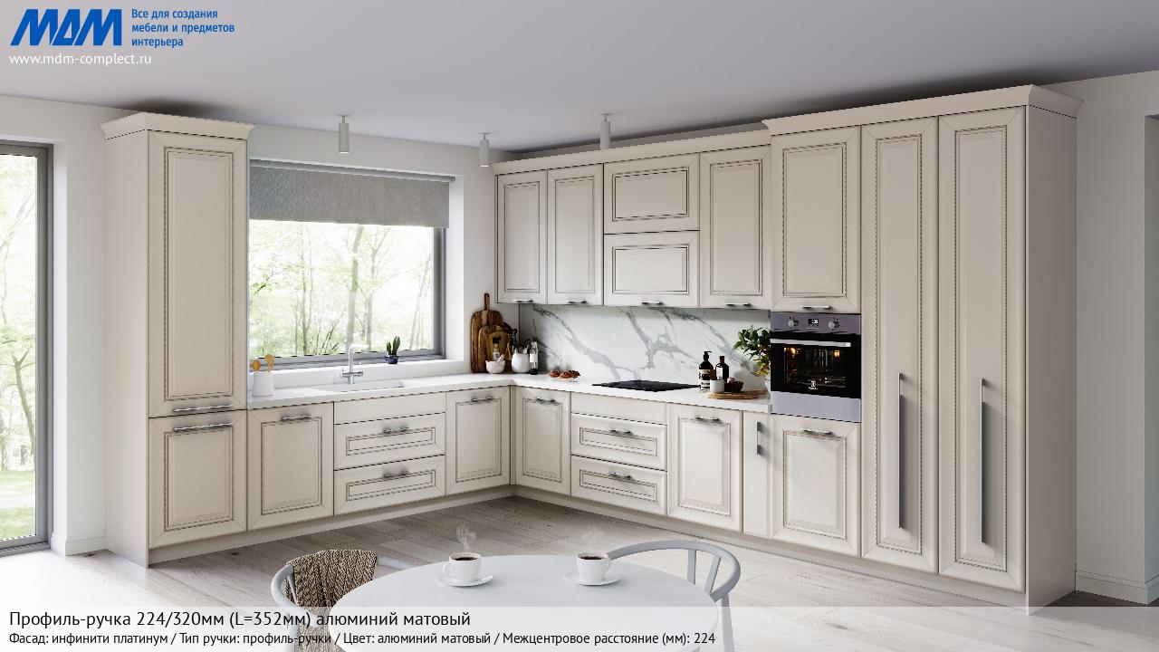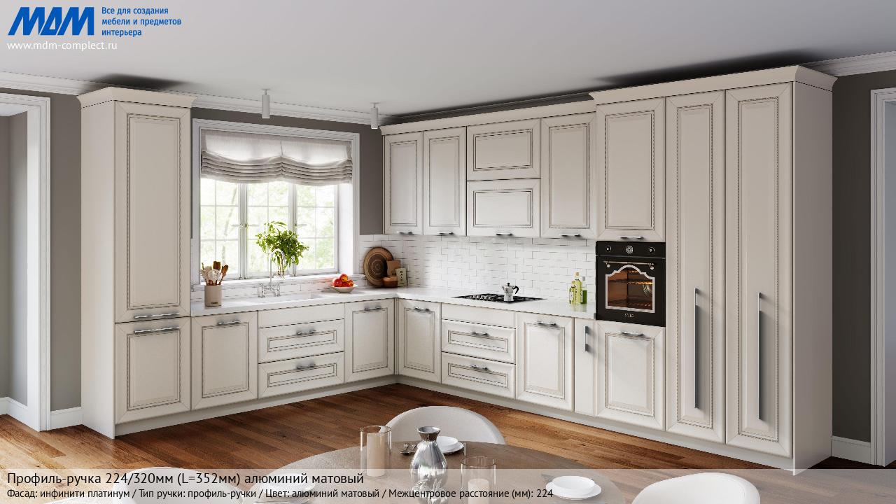 Мебельная Профиль-ручка 224/320мм (L=352мм) алюминий матовый на различных фасадах в кухонном интерьере в стиле классика, лофт, модерн.