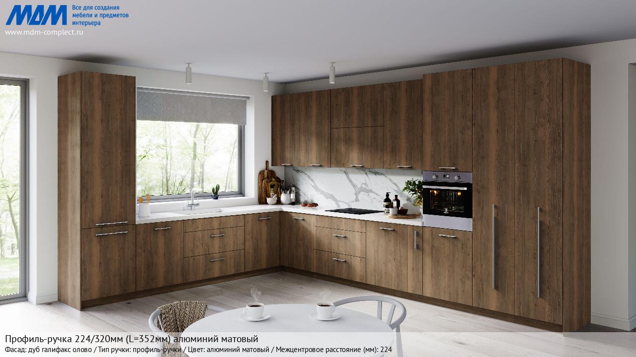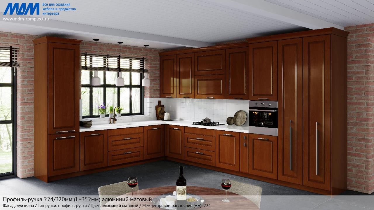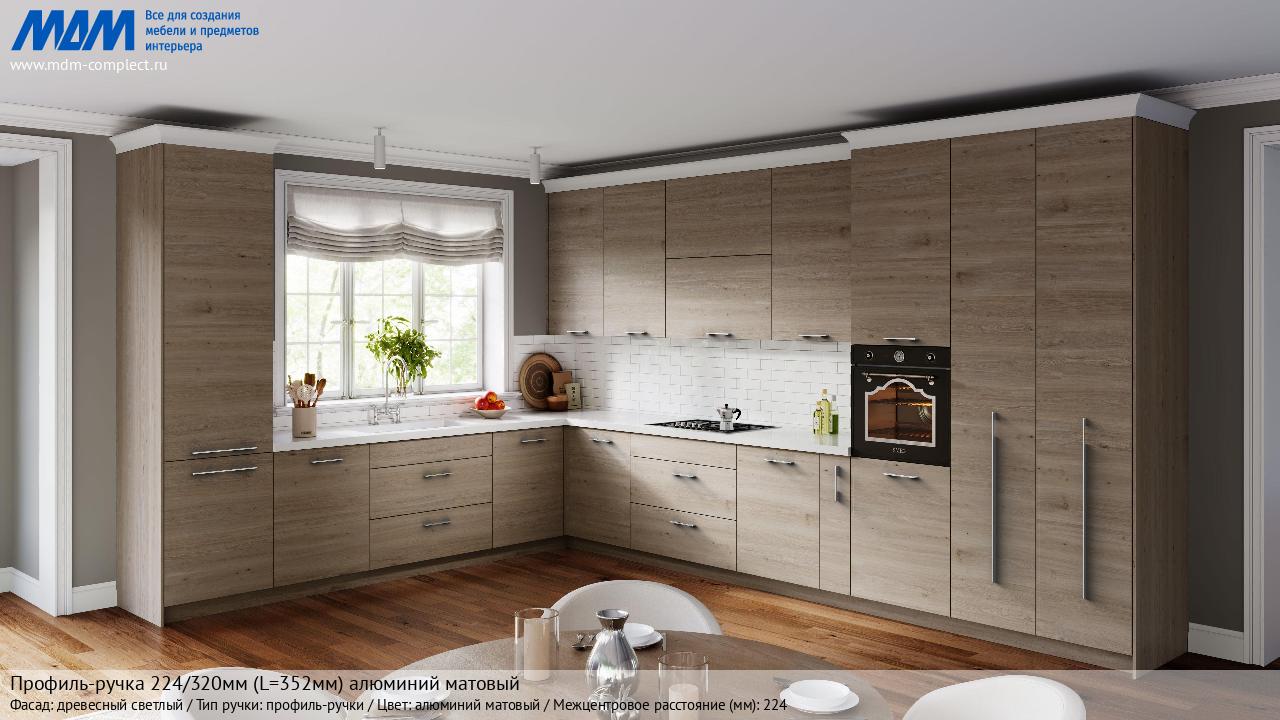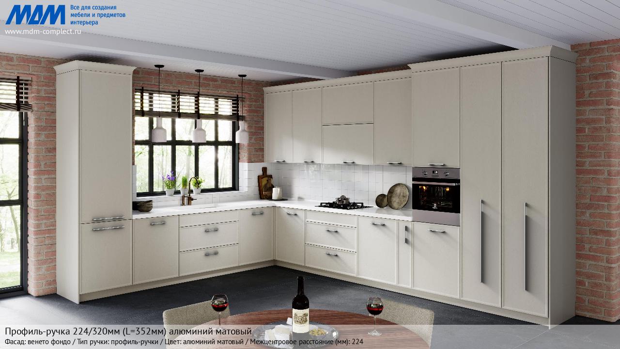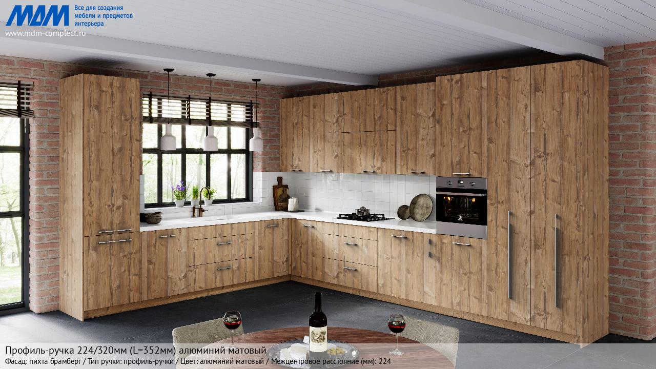 Мебельная Профиль-ручка 224/320мм (L=352мм) алюминий матовый на различных фасадах в кухонном интерьере в стиле классика, лофт, модерн.
