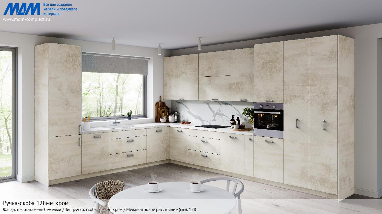 Мебельная Ручка-скоба 128мм хром на различных фасадах в кухонном интерьере в стиле классика, лофт, модерн.