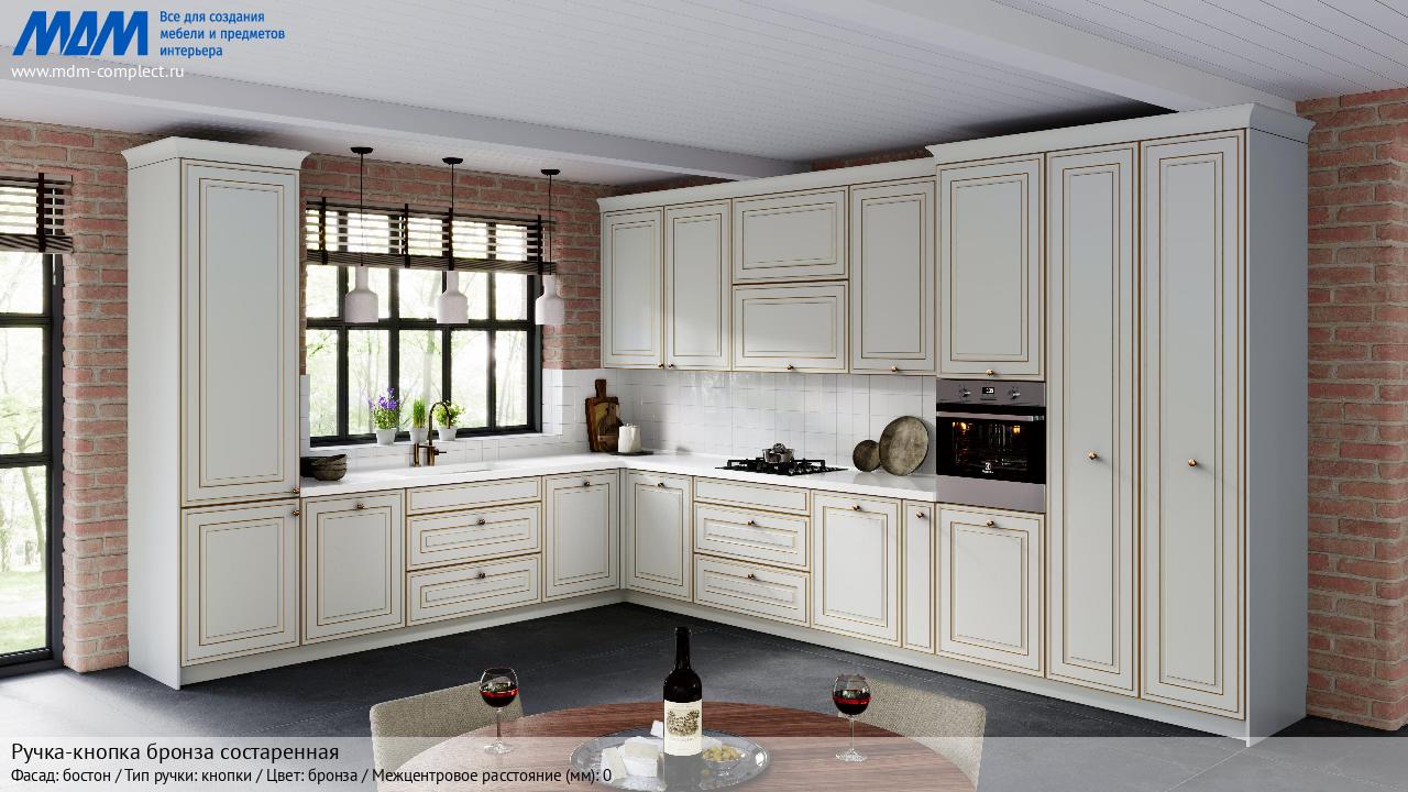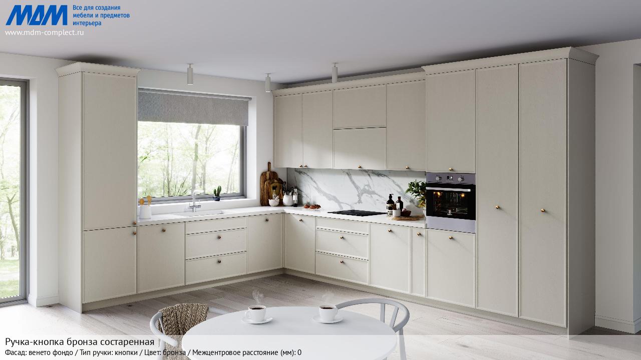 Мебельная Ручка-кнопка бронза состаренная на различных фасадах в кухонном интерьере в стиле классика, лофт, модерн.