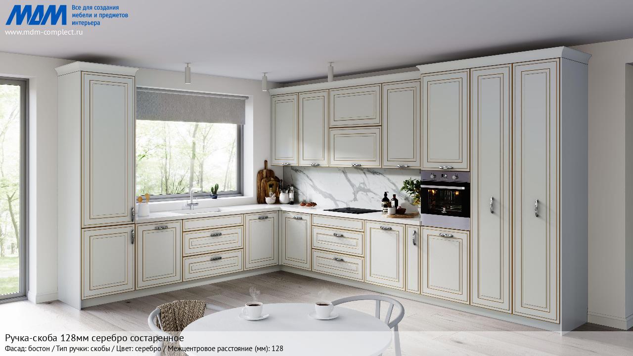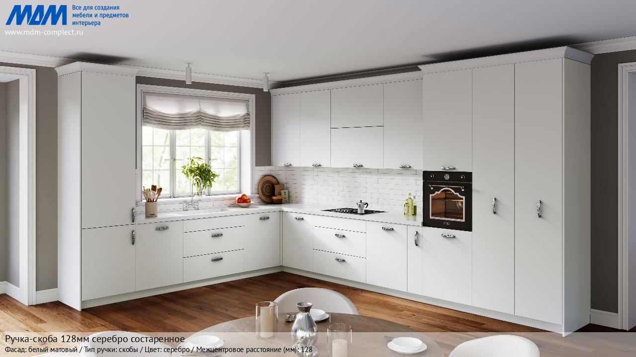 Мебельная Ручка-скоба 128мм серебро состаренное на различных фасадах в кухонном интерьере в стиле классика, лофт, модерн.