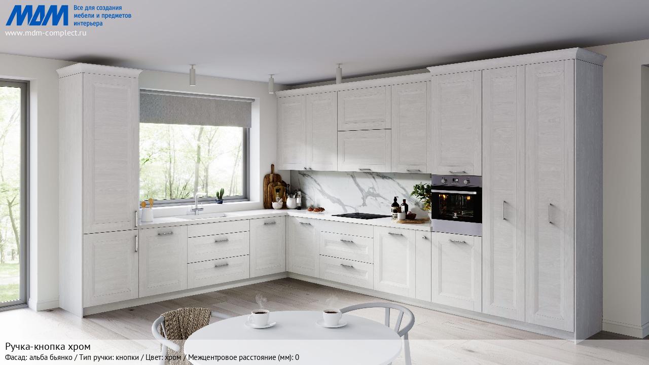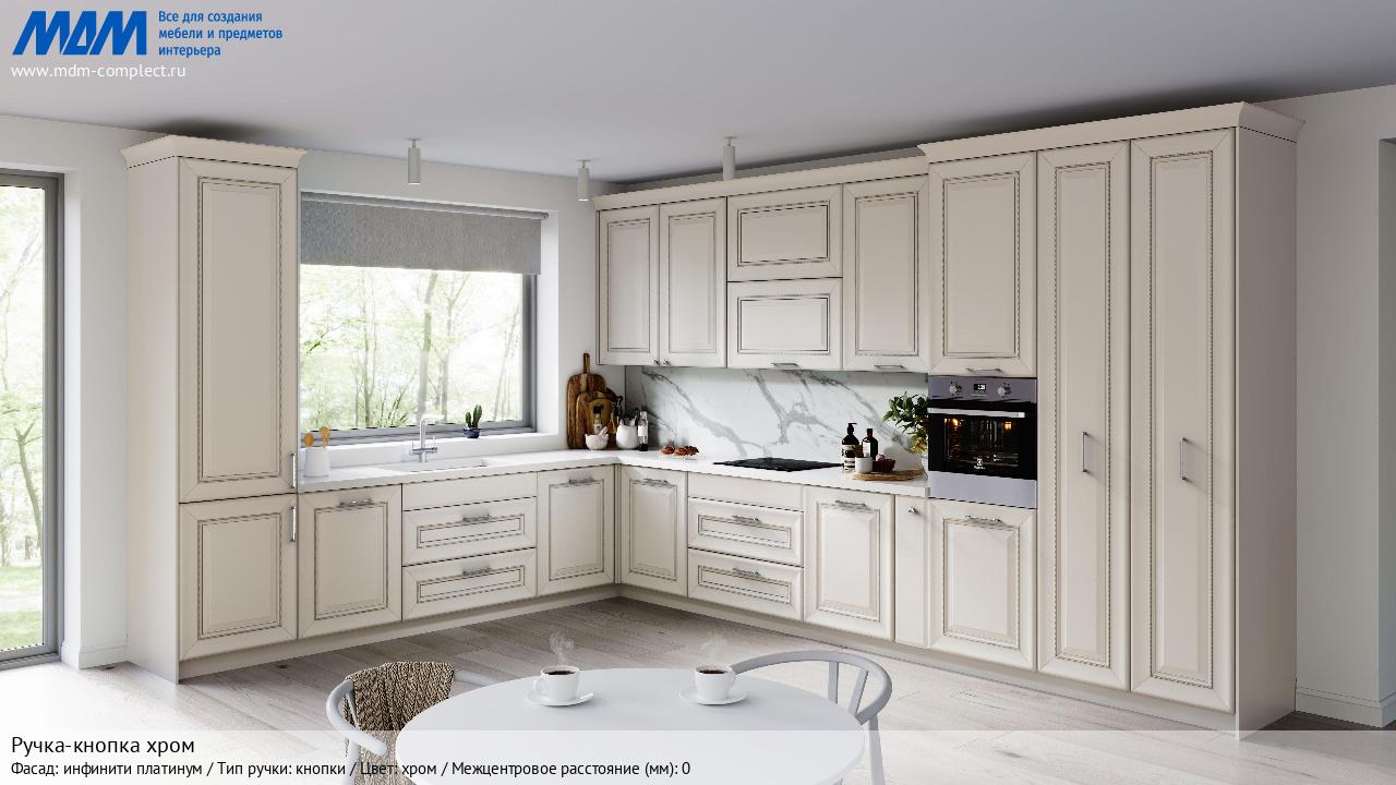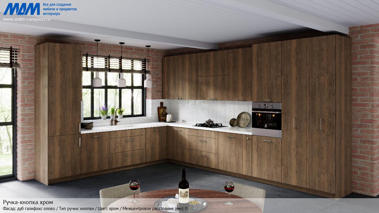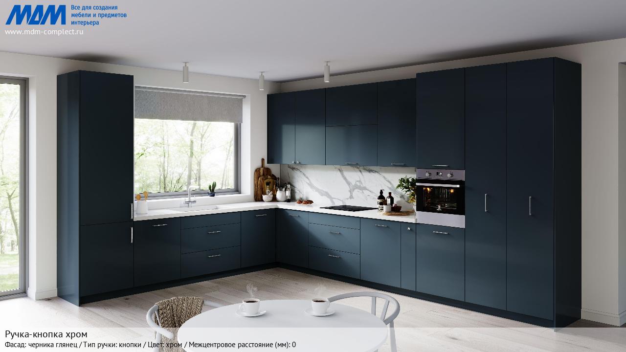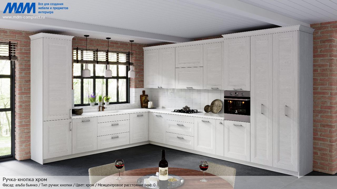 Мебельная Ручка-кнопка хром на различных фасадах в кухонном интерьере в стиле классика, лофт, модерн.